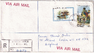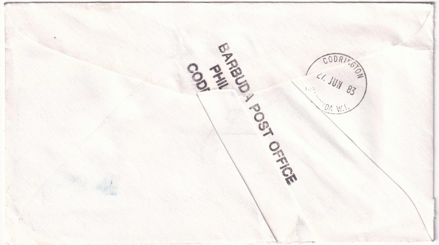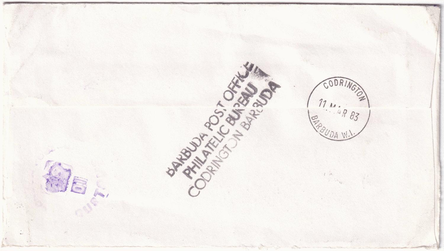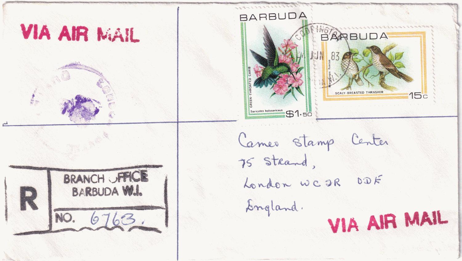 Absender ist jeweils das philatelistische Büro von Barbuda in Codrington, dem Hauptort der Insel Barbuda. Der violette Stempel ist vom Zoll. Auf dem einen Brief kann man unten "Custom" lesen. Nett auch die beiden Einschreibestempel.