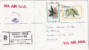 zwei Einschreibebriefe aus dem Jahr 1983 aus Barbuda nach London mit Vogelmotiven: