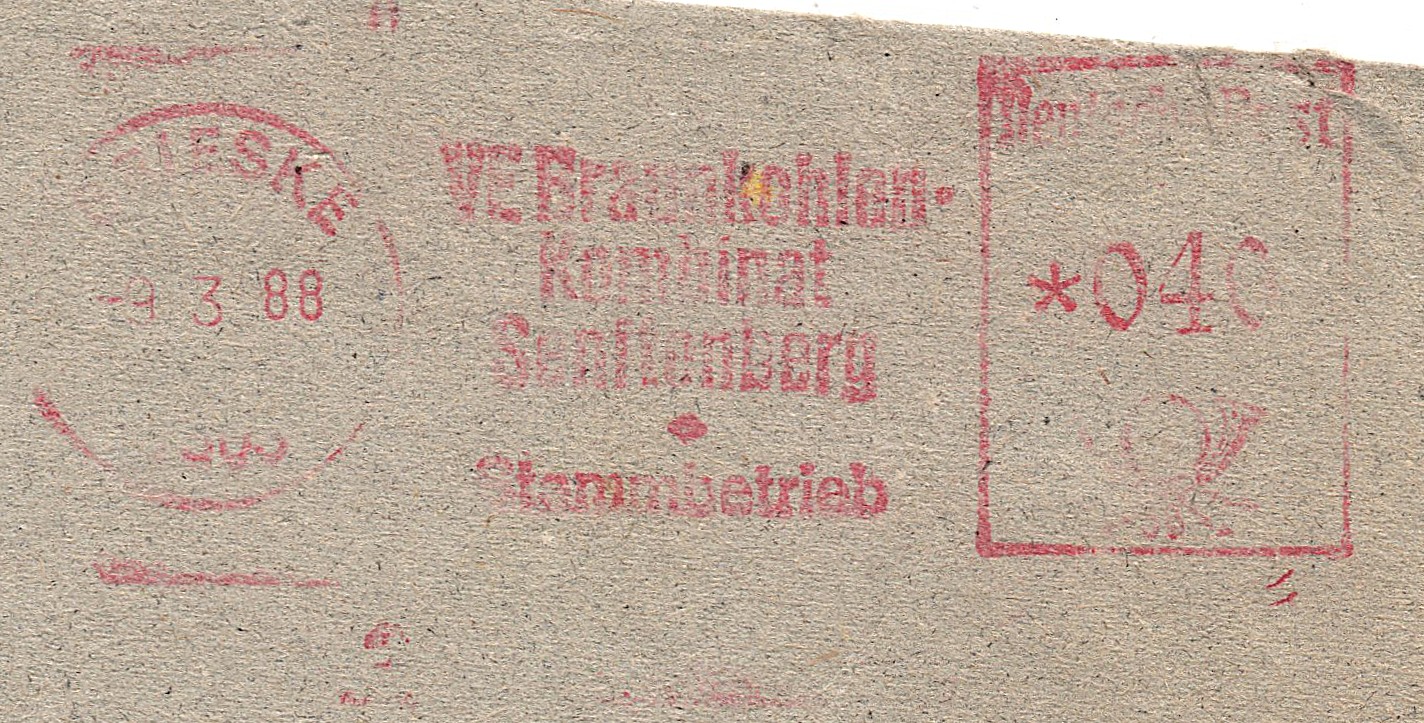 Übergroßer Brief, leider im typischen DDR-grauen Papier, vom VE Braunkohlenkombinat Senftenberg, Stammbetrieb Brieske 7803 zum Energiekombinat Magdeburg abgestempelt mit 2 AFS von Brieske vom 09.03.1988 mit 20 und 40 Pfennige.