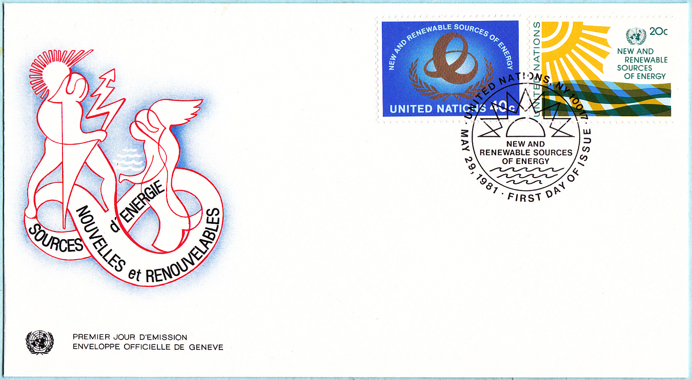 Bei dem FDC handelt es sich um einen offiziellen französischsprachigen Umschlag der UNO Genf "Premier Jour d'Emission / Envelope Officielle de Genève" bzw. "Edition des Nations Unies, Genève" mit Schmuckeindruck zur Ausgabe "Sources d'Energie Nouvelles et Renouvelables" designt vom schweizer Grafiker Claude Rychner; siehe [1]. Mit eingedrucktem Ersttagsstempel FIRST DAY OF ISSUE der UNITED NATIONS, NY 10017 (New York) vom MAY 29, 1981.