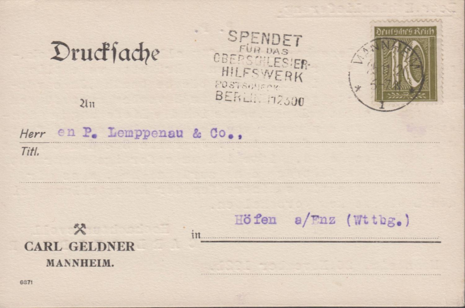Drucksache 25.11.1921 Mannheim - Höfen/Enz zum Tarif der Drucksachen-Karten 10 Pf. versandt.