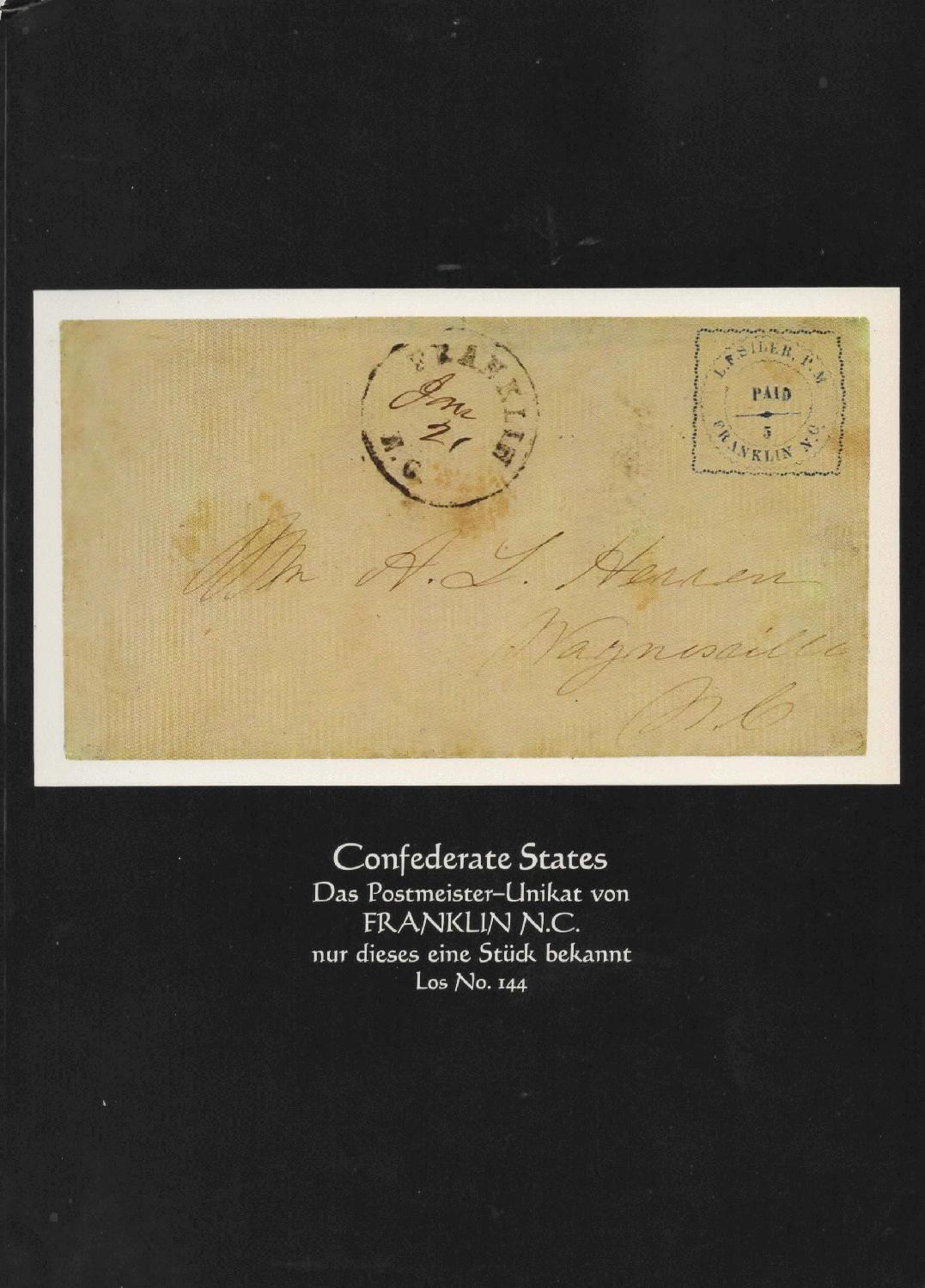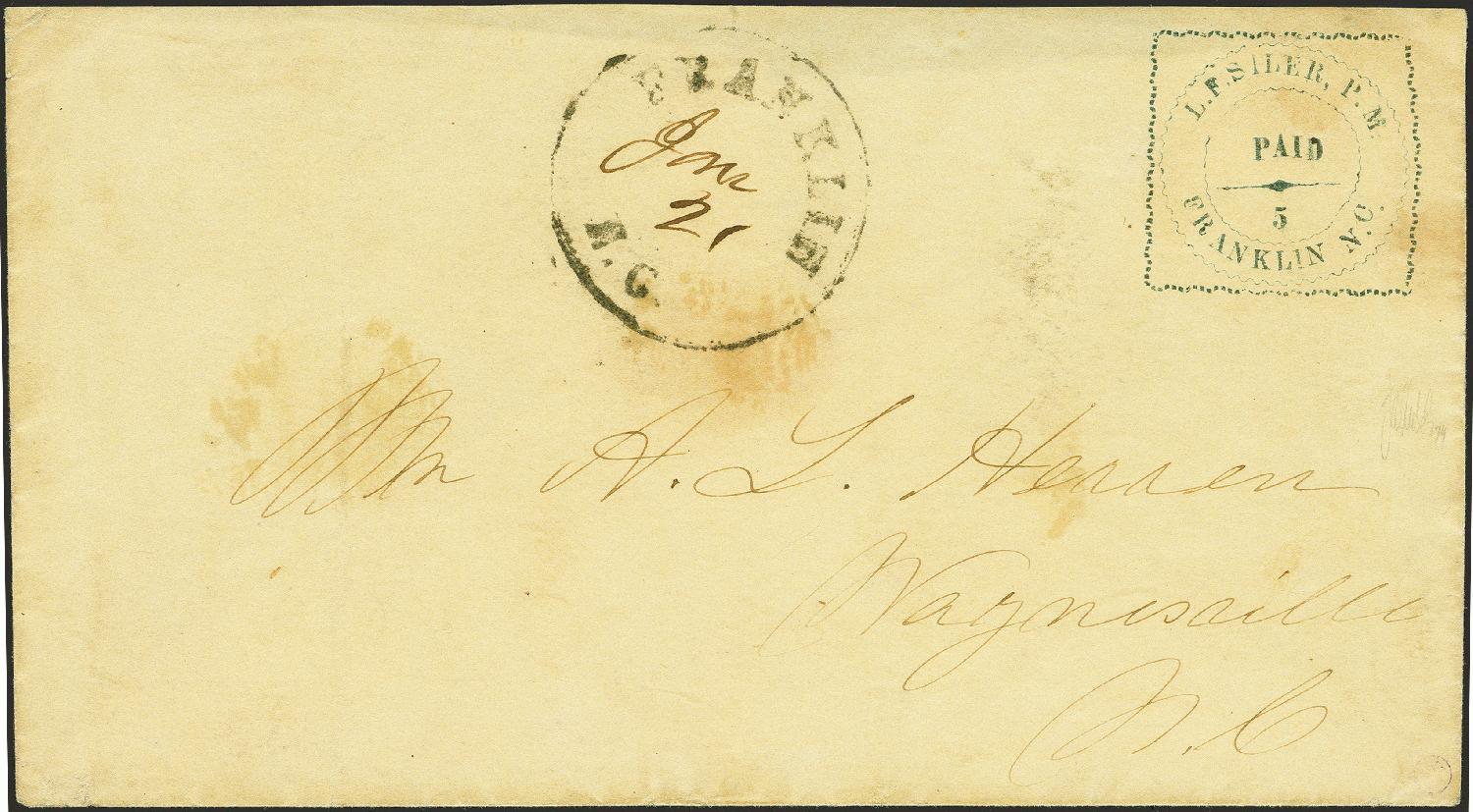 die Scott no. 25XU1 zeigt das Provisorium von Franklin North Carolina auf einem Brief vom 21. Jaunar 1862, von Franklin nach Waynesville N.C. Man kennt auch heute nur dieses eine Stück!