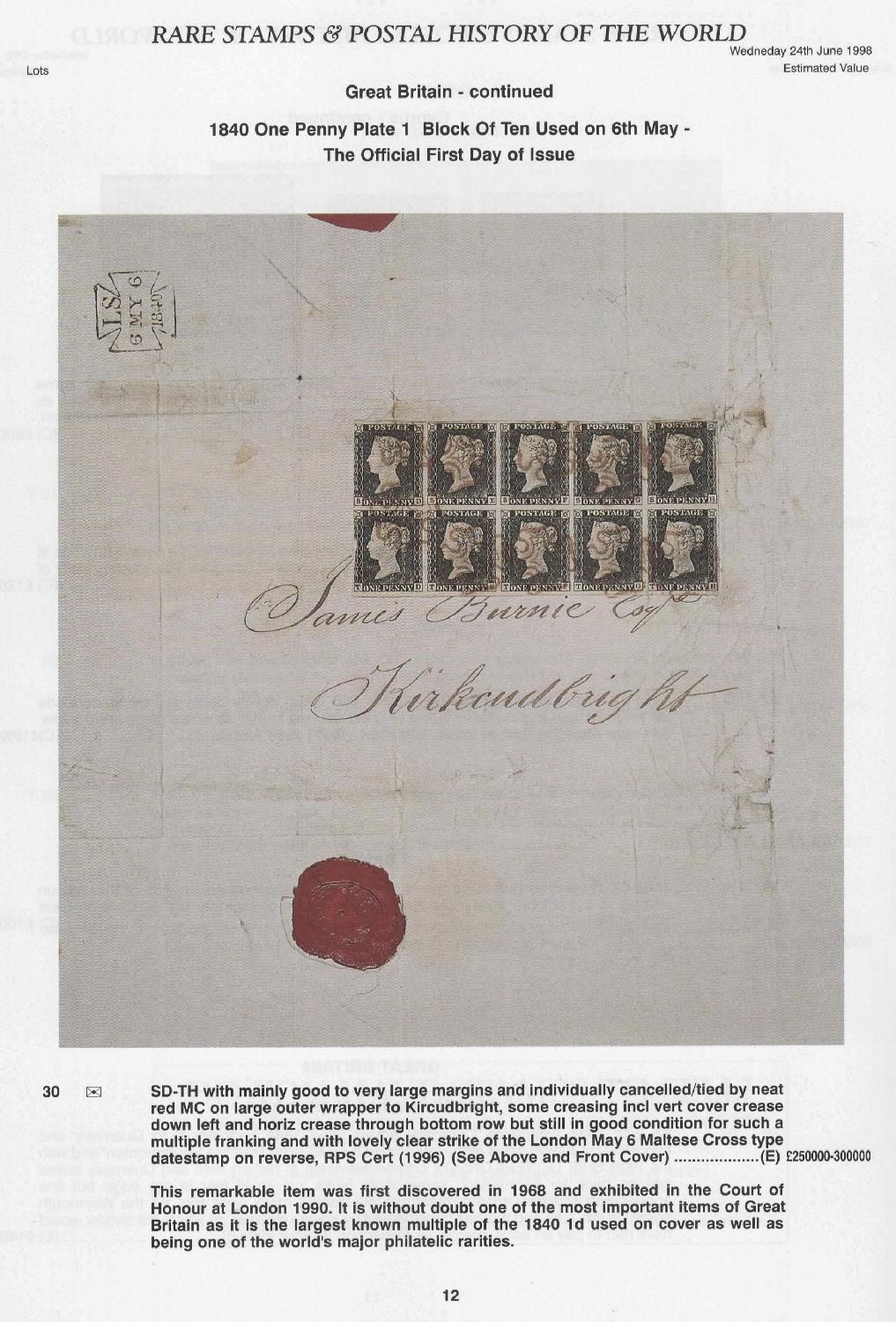 Dieses Stück brachte sogar die Queen Elizabeth dazu, einen Kaufauftrag zu platzieren! (Wir wissen: eigentlich erbte die Queen 1952 die phantastische königliche Sammlung «British Commonwealth» ihres Grossvaters George V. und Vaters George VI.; und die Sammlung erfuhr nur noch wenig Änderungen. 1998 kam es dann zum grossen Ereignis, als Stanley Gibbons den Zehnerblock-Ersttag-Brief anbieten durfte. Die wichtigen Sammler wussten alle, dass die Queen den Brief kaufen wollte, und natürlich war man grosszügig und überliess ihr den Brief zum Startpreis von damals GB£ 220'000 (+15 % = GB£ 253'000). So kam dieser wunderbare Brief Ende des 20. Jahrhunderts in die königliche Sammlung der Queen.