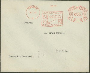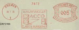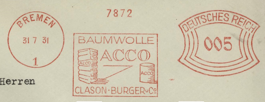 Ein Briefumschlag der Bremer Firma wirbt am 31.7.1931 für Baumwolle der Marke ACCO.