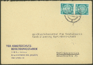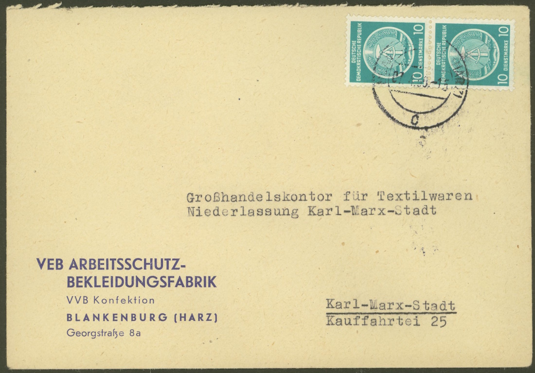 In Blankenburg am Harz gab es früher die VEB Arbeitsschutz-Bekleidungsfabrik, wie dieser Brief vom 7.4.1958 belegt, aber zum Ende der DDR wird er bereits nicht mehr in der Liste der VEB-Betriebe in Bad Blankenburg geführt [1].
