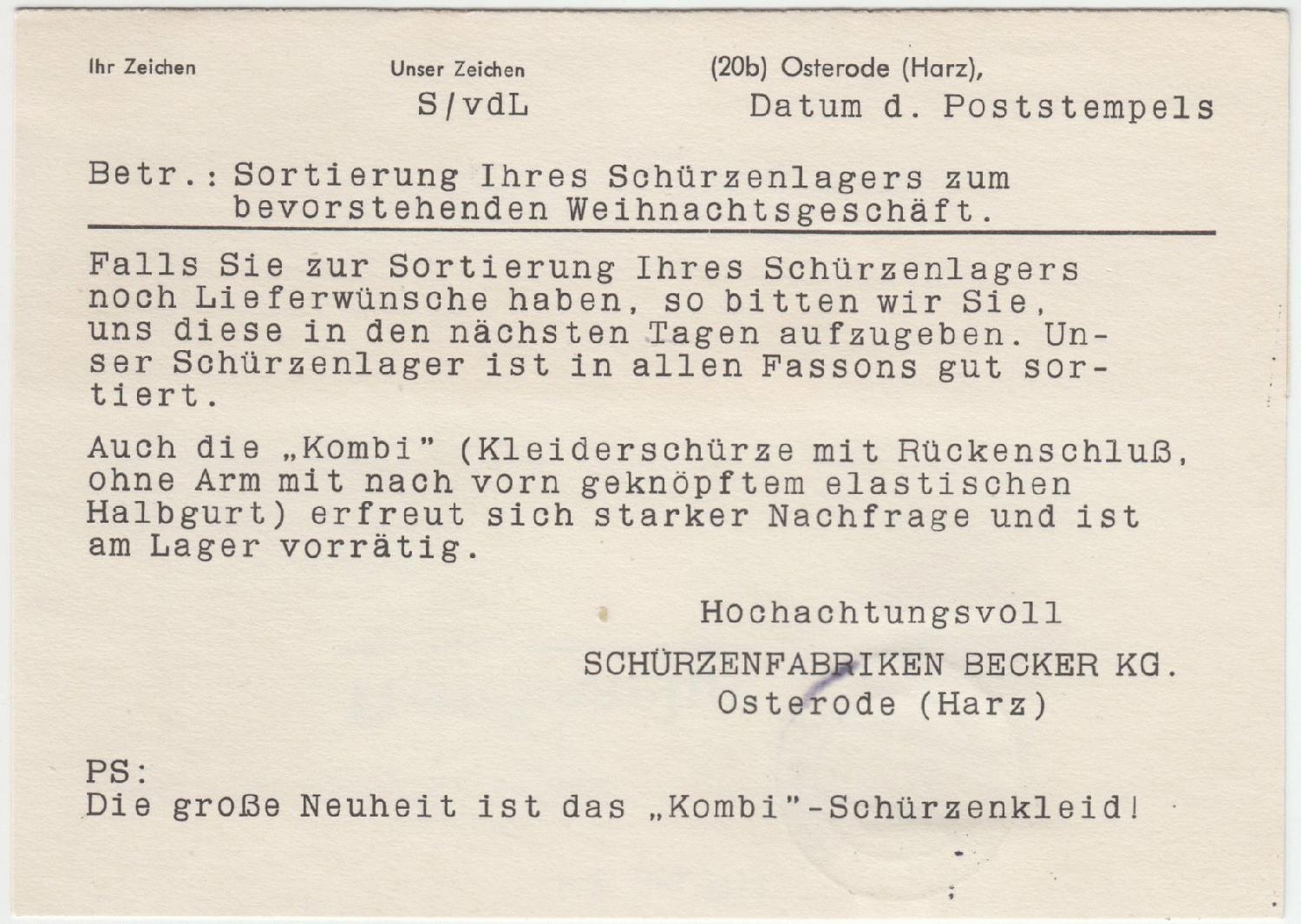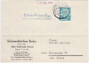 eine Postkarte - Drucksache - von den Schürzenfabriken Becker aus Osterode am Harz vom 11.12.1954.