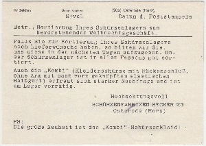 eine Postkarte aus Münchehof an die Schuhgroßhandlung Heinrich Hinrichs in Braunschweig vom 27.2.1945. Die Fa. Heinrich Hinrichs ist innerhalb Braunschweigs umgezogen. Die ursprüngliche Angabe "Geiselerwall 2" wurde in "Riddagshausen" geändert.