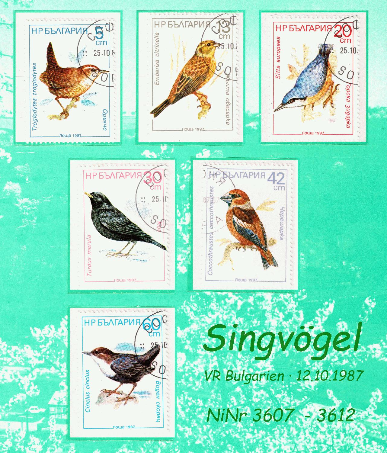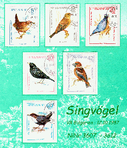Aus einem typischen DDR-Briefmarkenkalender der DDR der in Bulgarien herausgegebene Satz “Singvögel“, MiNr 3607 – 2612, 12.10.1987; natürlich ohne den dazugehörigen Kleinbogen.