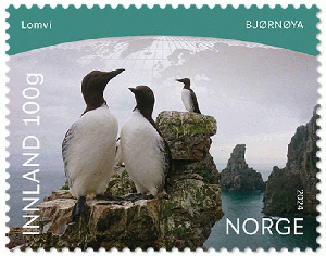 Am 14.03.2024 erschienen drei Briefmarken mit Bildern von Bjørnøya. Auf einer der drei Marken sieht man die Trottellummen (Uria aalge), Norwegisch Lomvi. Man sieht gut, dass der Schnabel komplett schwarz ist. Auf Bjørnøya ist einer der wenigen ihrer Brutplätze in Norwegen. Die beiden anderen Briefmarken zeigen die Sehenswürdigkeiten Sylen und Hambergfjellet.