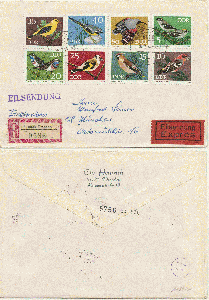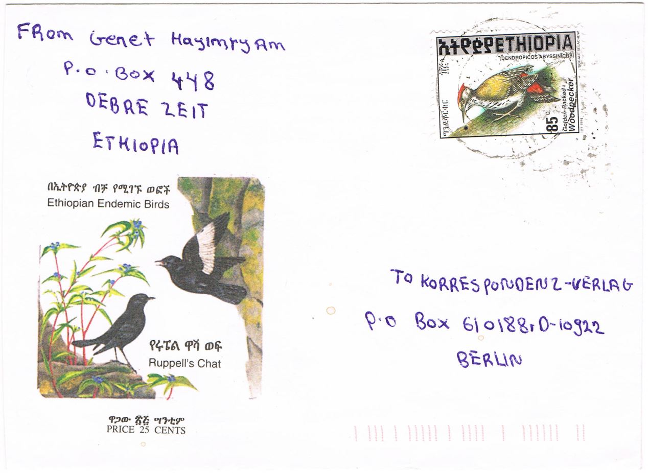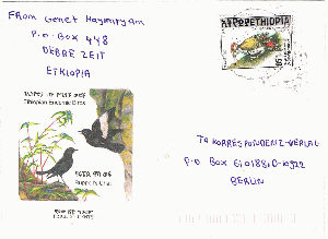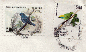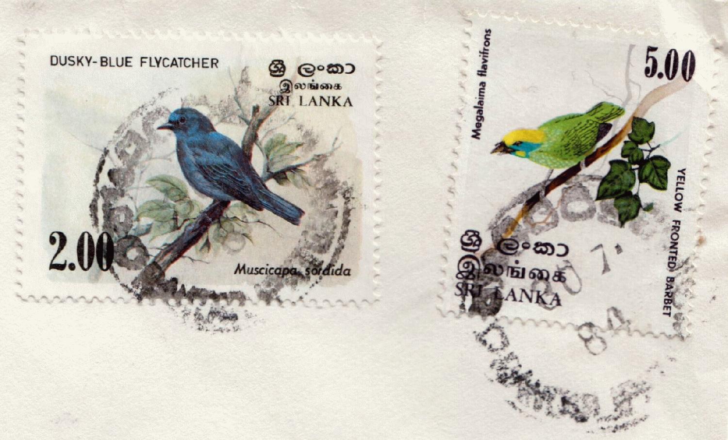 von mir zwei einheimische Vögel aus Sri Lanka. Wenn die Online-Übersetzung richtig ist handelt es sich um einen Altblauen Fliegenschnäpper und einen Gelbstirn-Bartvogel. Verwendet auf einem Brief vom 30.7.1984.