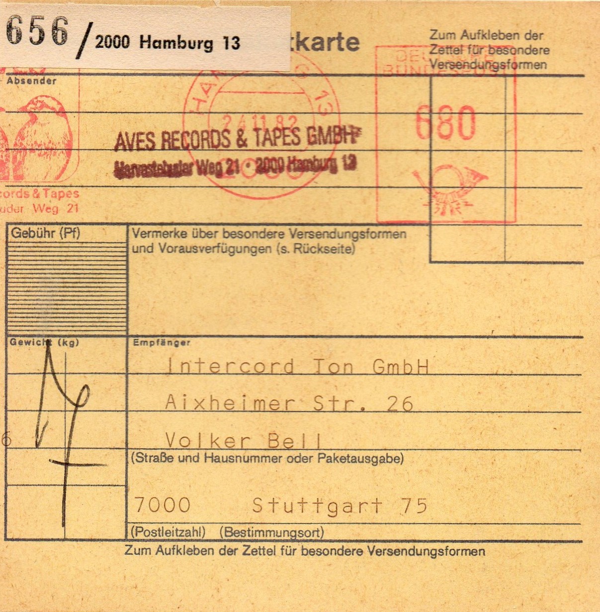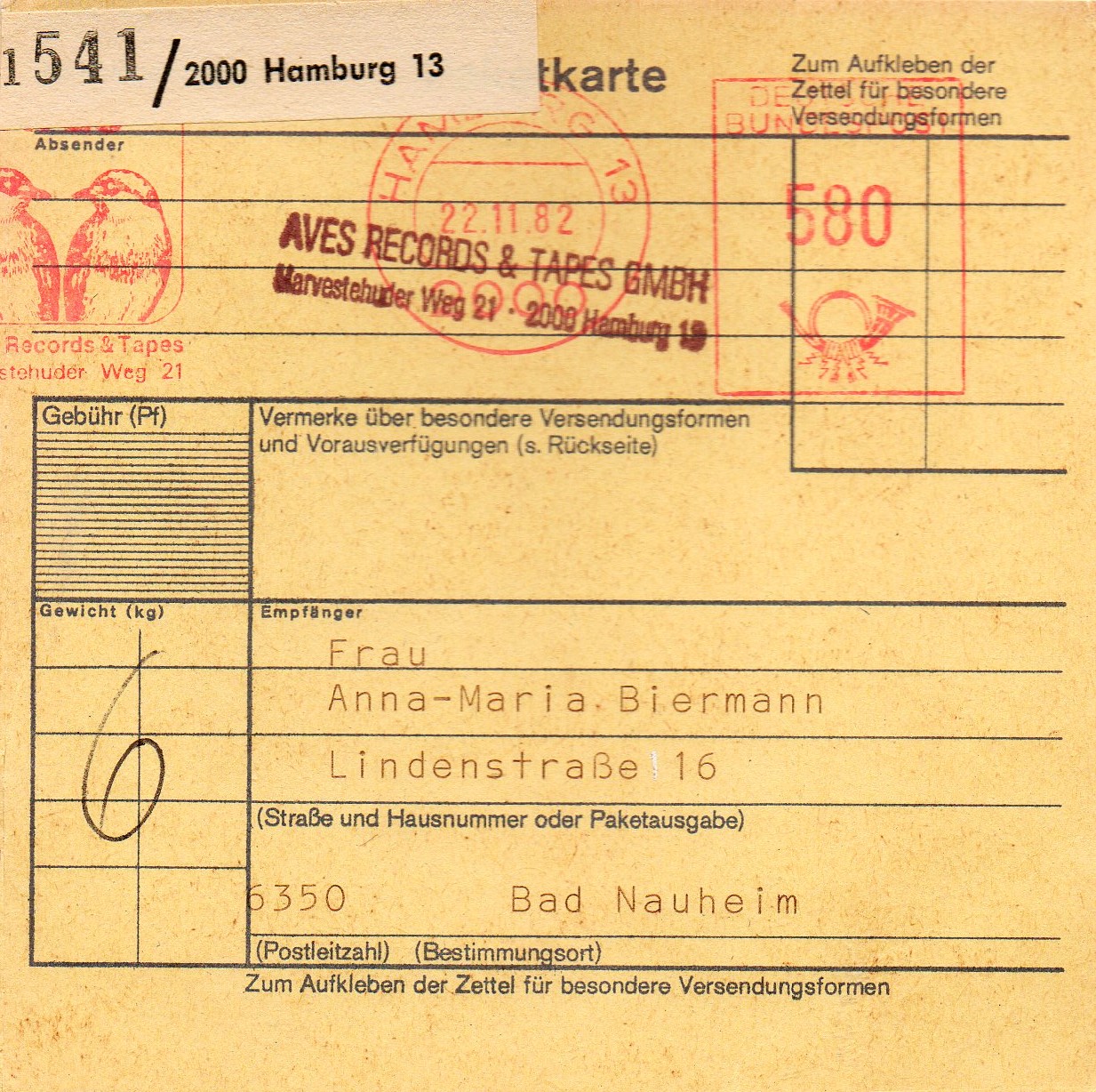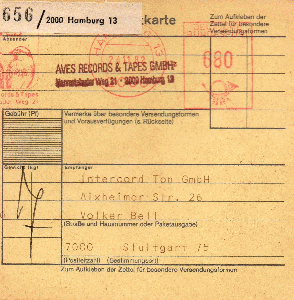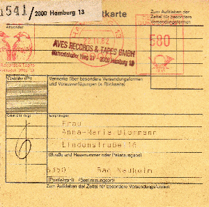 Die Firma AVES Records, in Hamburg 13 ansässig, nutzt eine AFS-Maschine, als Motiv dienen zwei Vögel, welcher Art sie sind, können vielleicht die Ornithologen bestimmen.