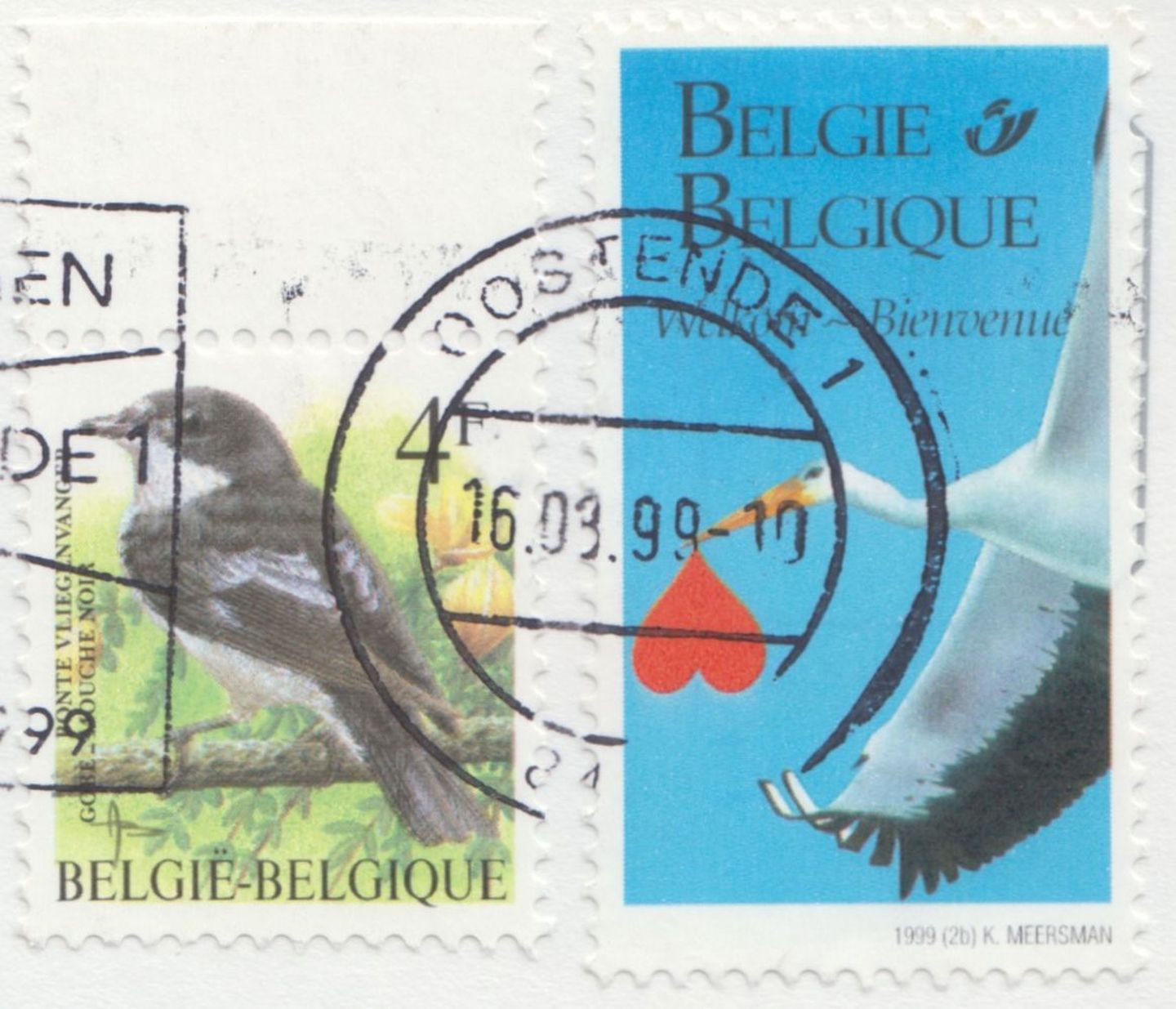 zwei Vögel aus Belgien auf Bedarfsbrief. Ein Storch und ein Trauerschnäpper (Ficedula hypoleuca). [1]
