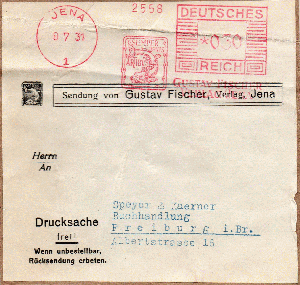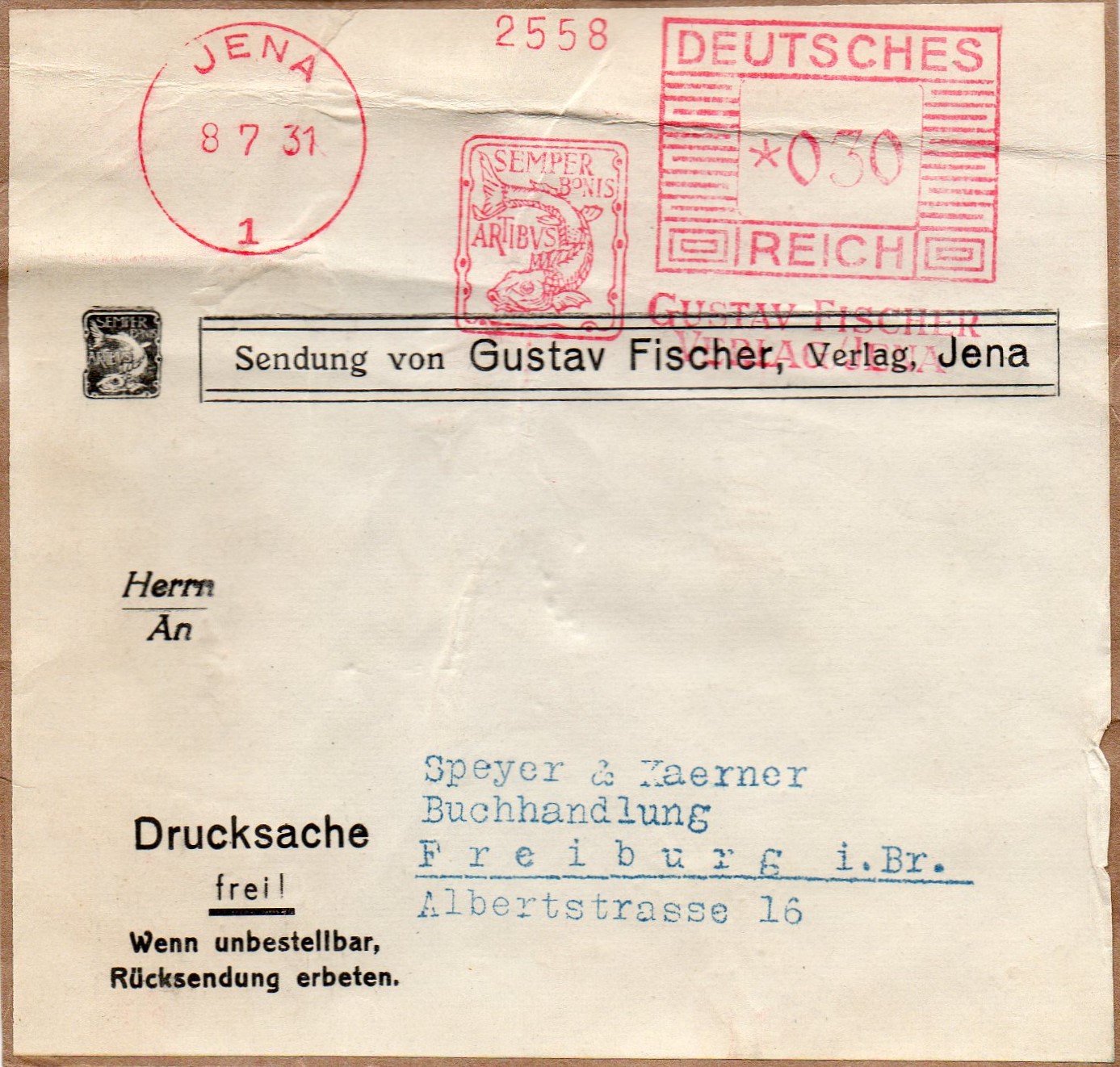Drucksache in der fünften Gewichtsstufe aus GERA vom Juli 1931, man nutzte eine Francotyp-AFS-Maschine E-2 mit dem Motiv eines Fisches.