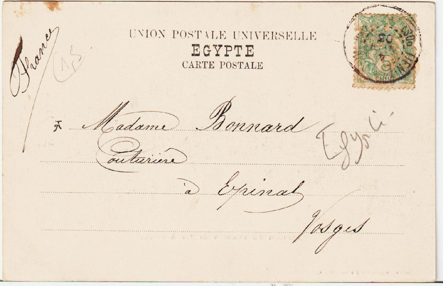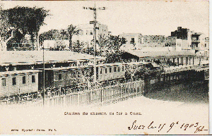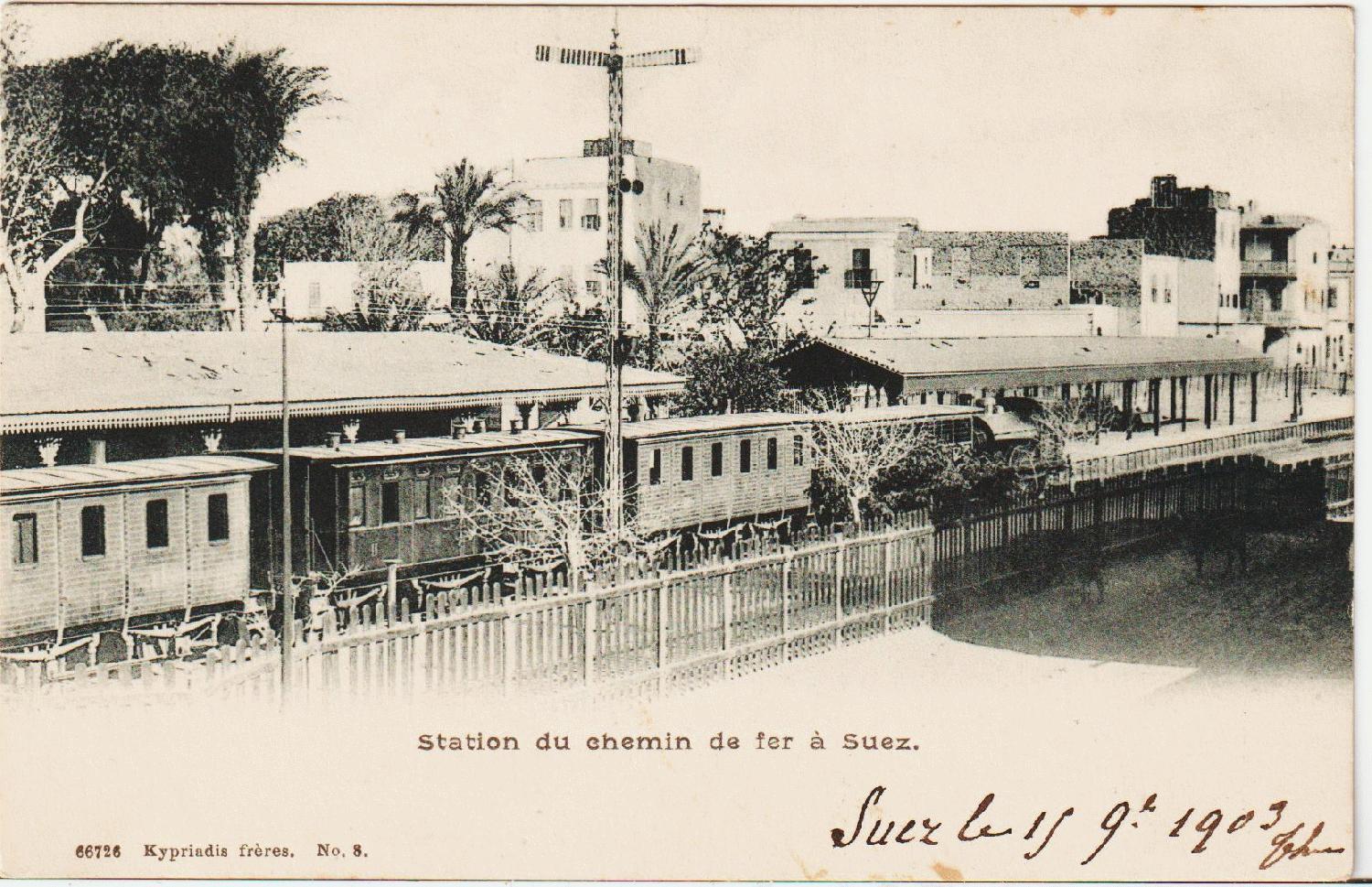 Der Bahnhof von Suez um 1905. Offensichtlich wurde die Karte aber in Indochina abgesandt, da die Briefmarke von da stammt. Sie ging nach Epinal im Elsass.