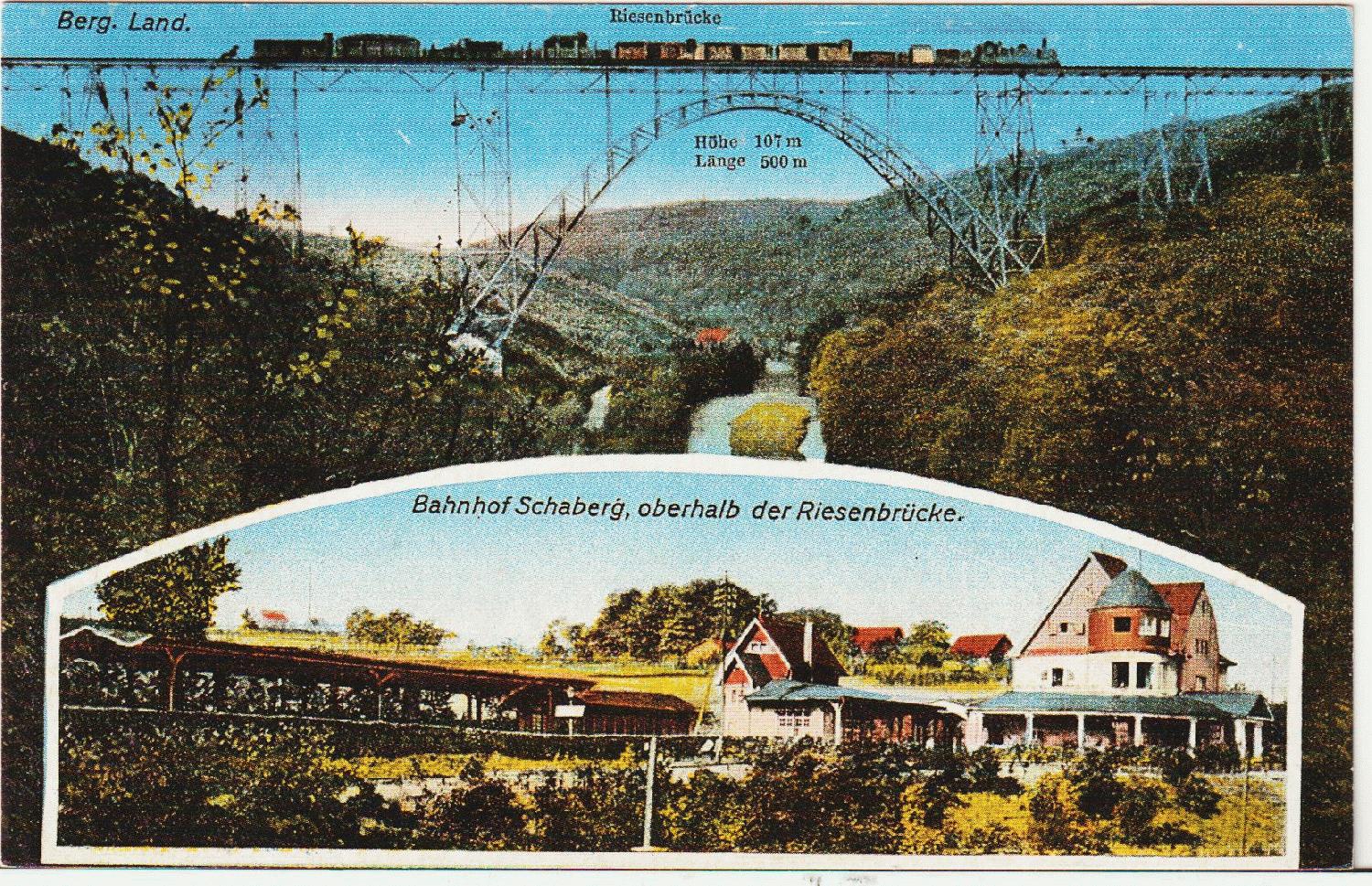 Der Bahnhof Schaberg liegt in einem Ortsteil von Solingen an der  Bahnstrecke Solingen – Remscheid. Die auf dieser Ansicht auch zu sehende Brücke wurde in  Beiträgen im Thema "Motiv Brücken" vielfach erwähnt. Die Karte ist nicht gelaufen und um 1915 entstanden.