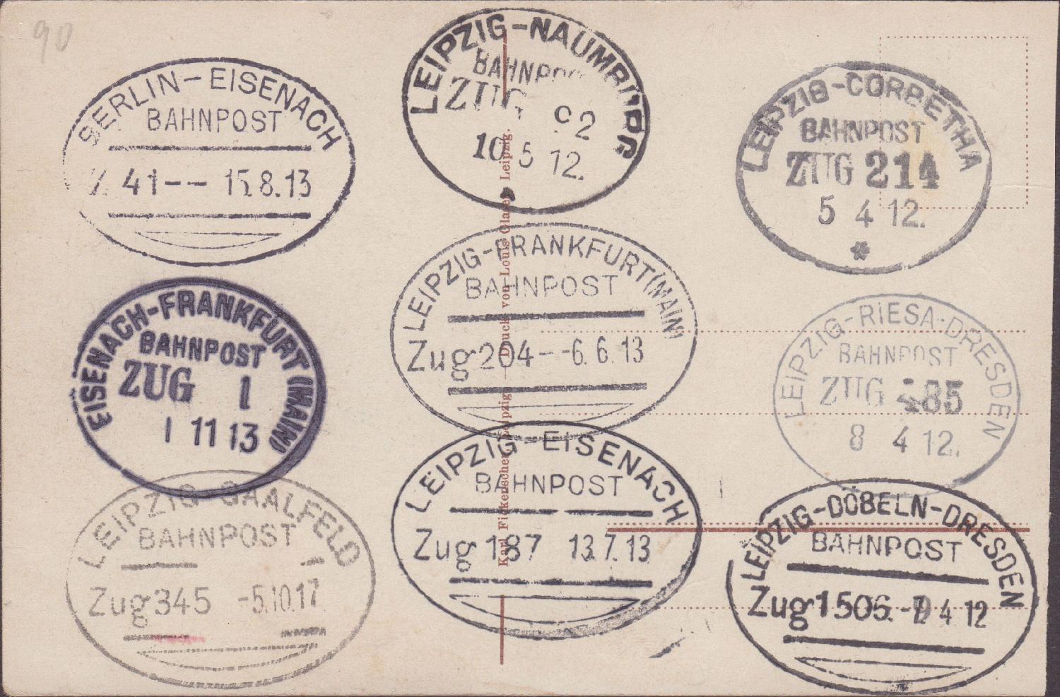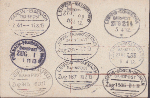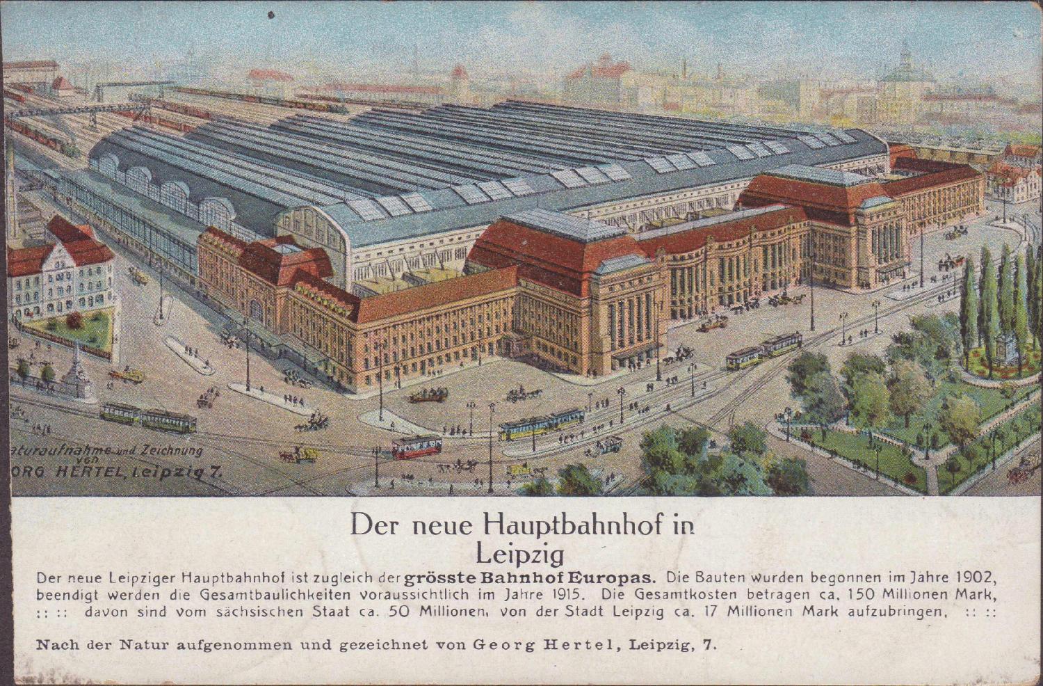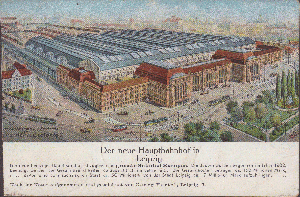 eine Postkarte wohl aus April 1912 vom Leipziger Hauptbahnhof. Der Bahnhof ist zu dieser Zeit noch nicht fertig. Die Eröffnung erfolgte 1915. Auf der Bildseite sind noch einige finanziellen Angaben zum Bau des Bahnhofs. Auf der Rückseite sind neun Bahnpoststempel aus der Zeit von April 1912 bis Oktober 1917 (hauptsächlich aus 1912 und 1913) abgeschlagen worden.