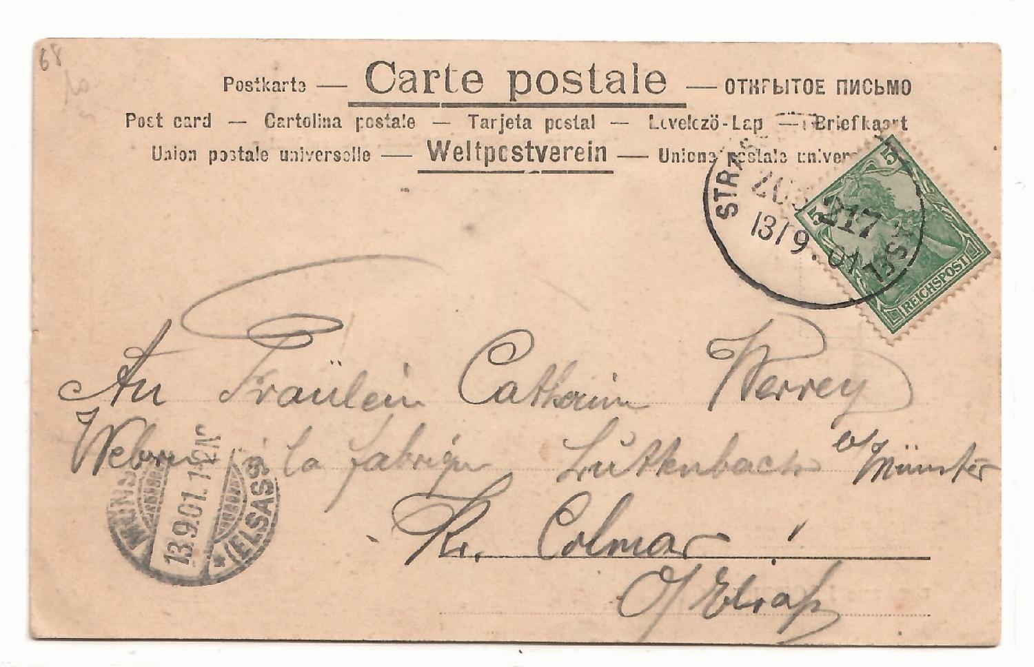 Die Karte lief am 13.09.1901 an eine Weberei in Lutterbach und zeigt dazu einen schönen Eisenbahnstempel.