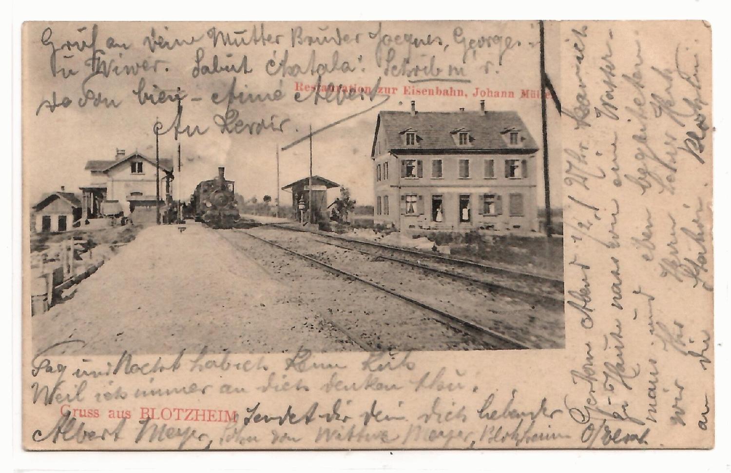 Es handelt sich um den Bahnhof in Blotzheim im Elsass, nicht weit entfernt vom Dreiländerecke und vom Rhein. Wer heute dort entlangfährt, kann ahnen, wie ländlich und urig die Gegend mal ausgesehen hat. Mittlerweile ist es ein Wechsel aus Agrarflächen und Industrieansiedlungen.