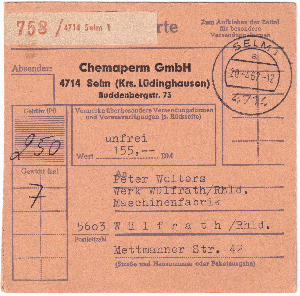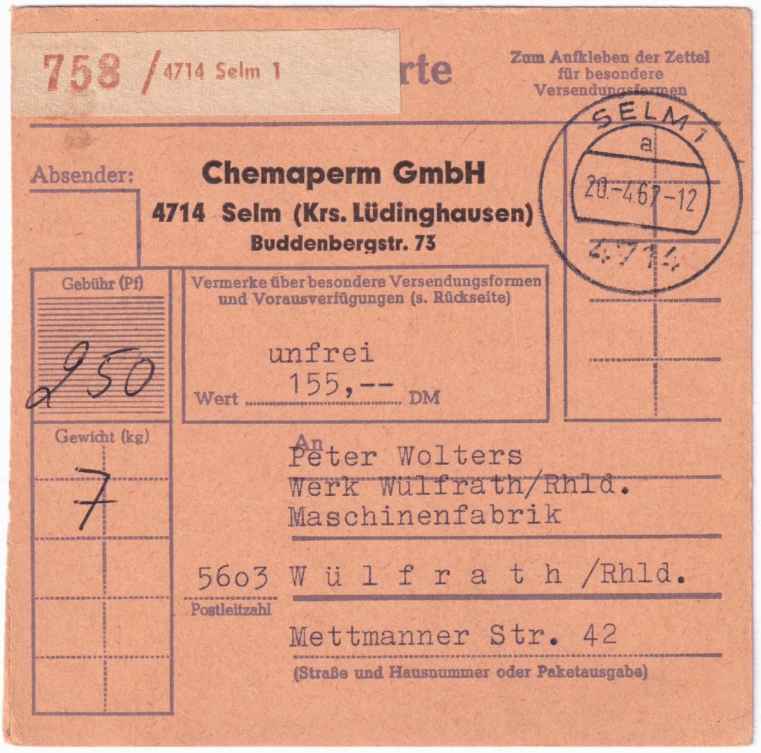 Ein unfreies Paket mit einem Wert von 155,- DM und einem Gewicht von 7 kg. Das Paket ging am 20.04.1967 von Selm nach Wülfrath. Laut Google Maps sind es über 80 km (Auto) und unter 70 km (Luftlinie).