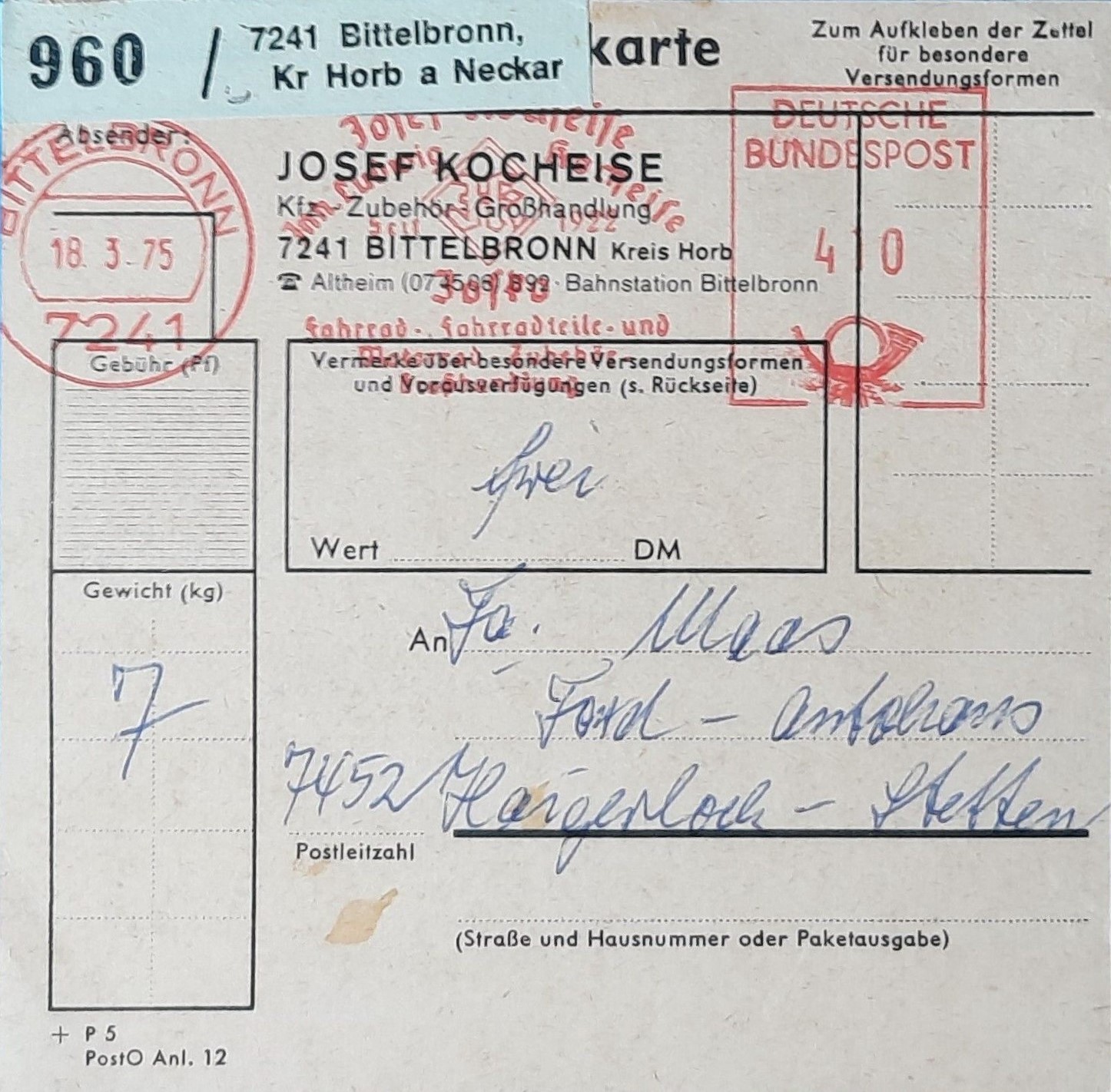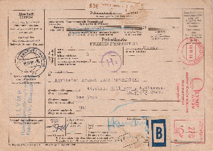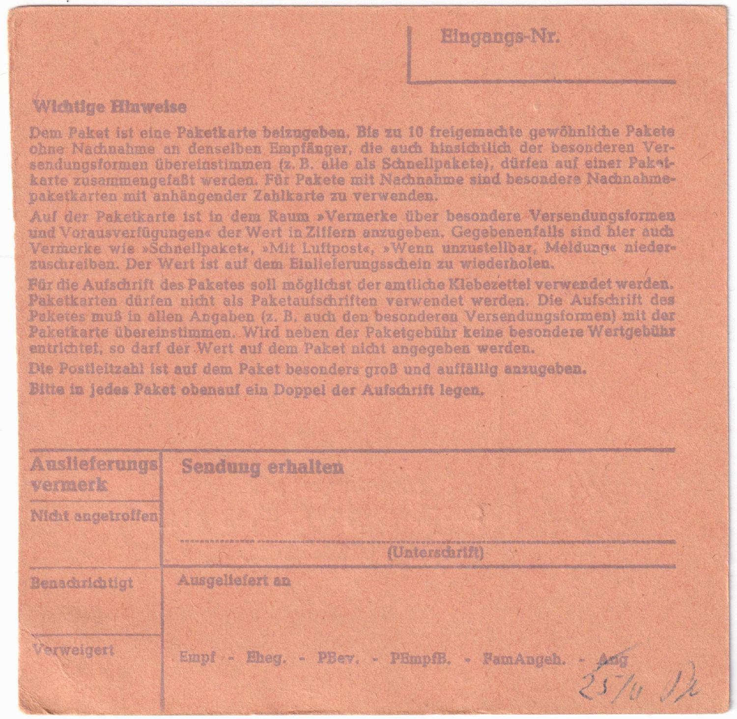 für meine kleine Heimatsammlung habe ich dies Paketkarte erworben: