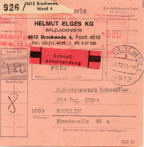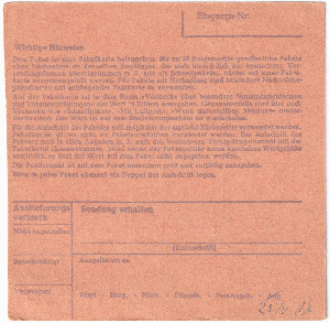 Als Hinweis zu meinem Eintrag [#94] nun doch der "Rückzieher", zumindest bei dem heute vorgestellten Beleg wurde der Begriff "Selbstbucher" auf dem Paketnummern-Zettel vermerkt, es könnte also sein, dass die eine oder andere Firma doch eigenen Zettel mit Nummernfolge besaß, die dann auf der Paketkarte verklebt wurden. Oder gab es hier besondere Postschalter?