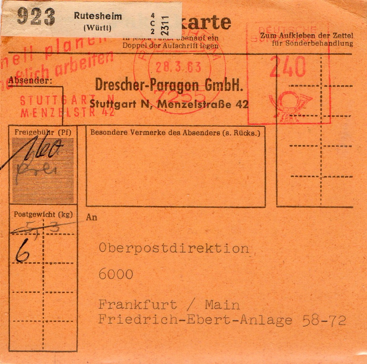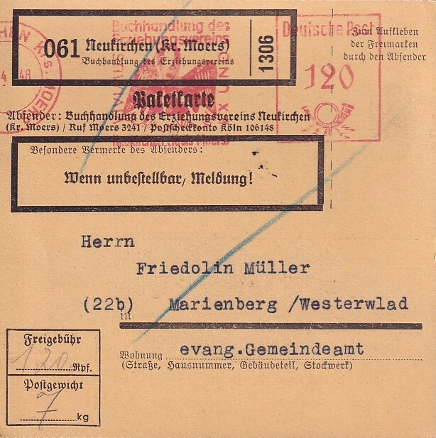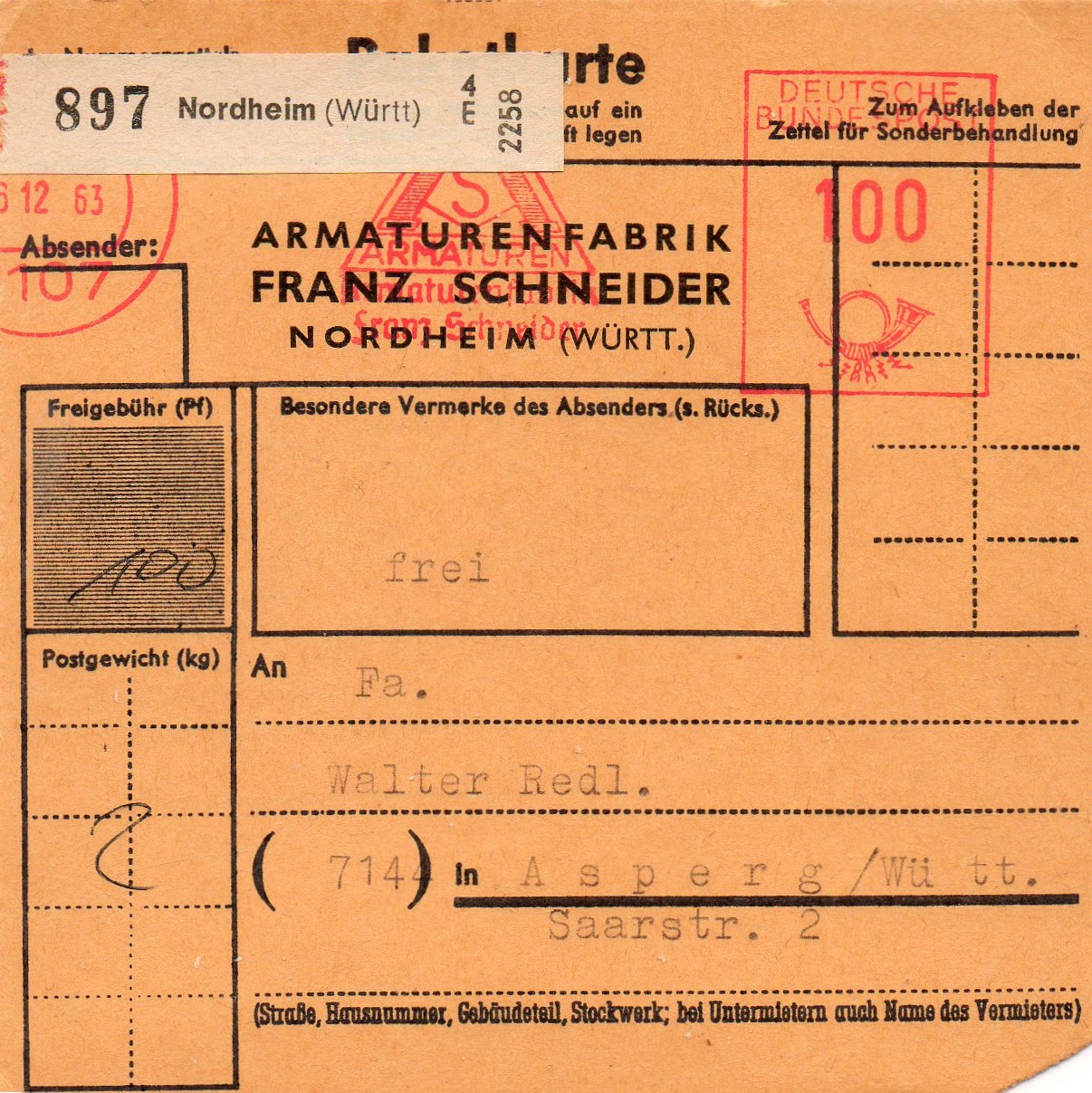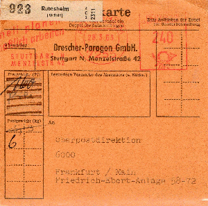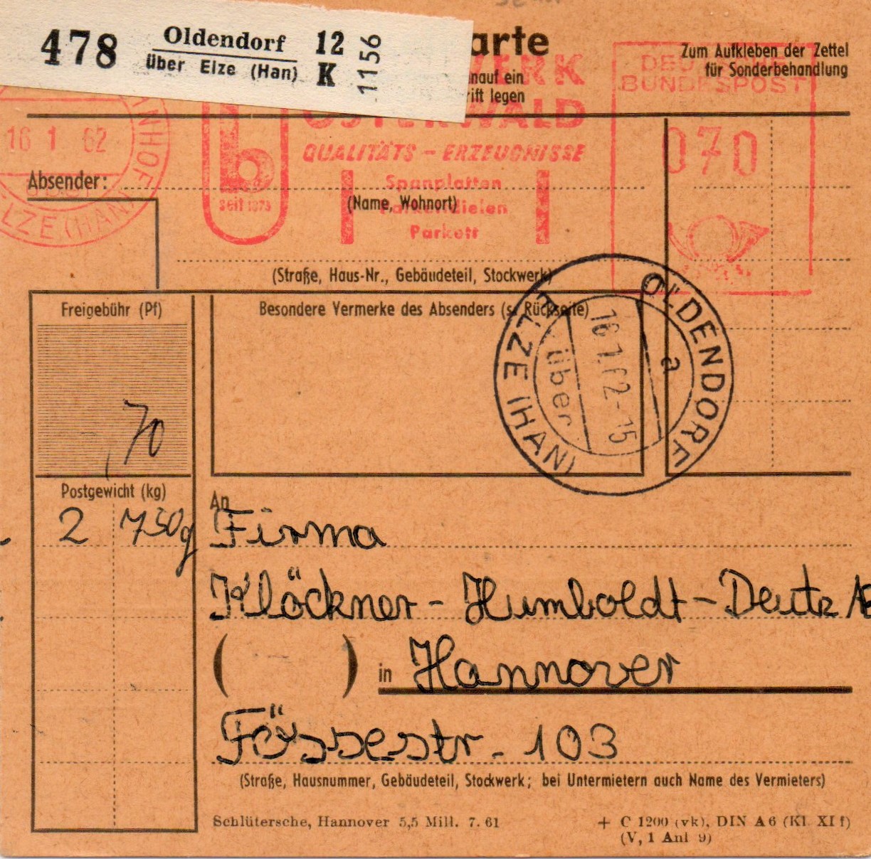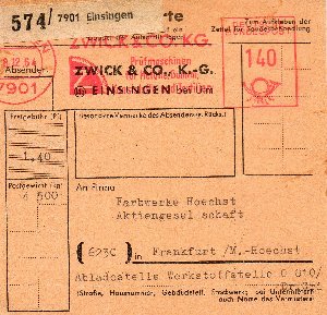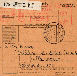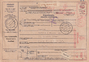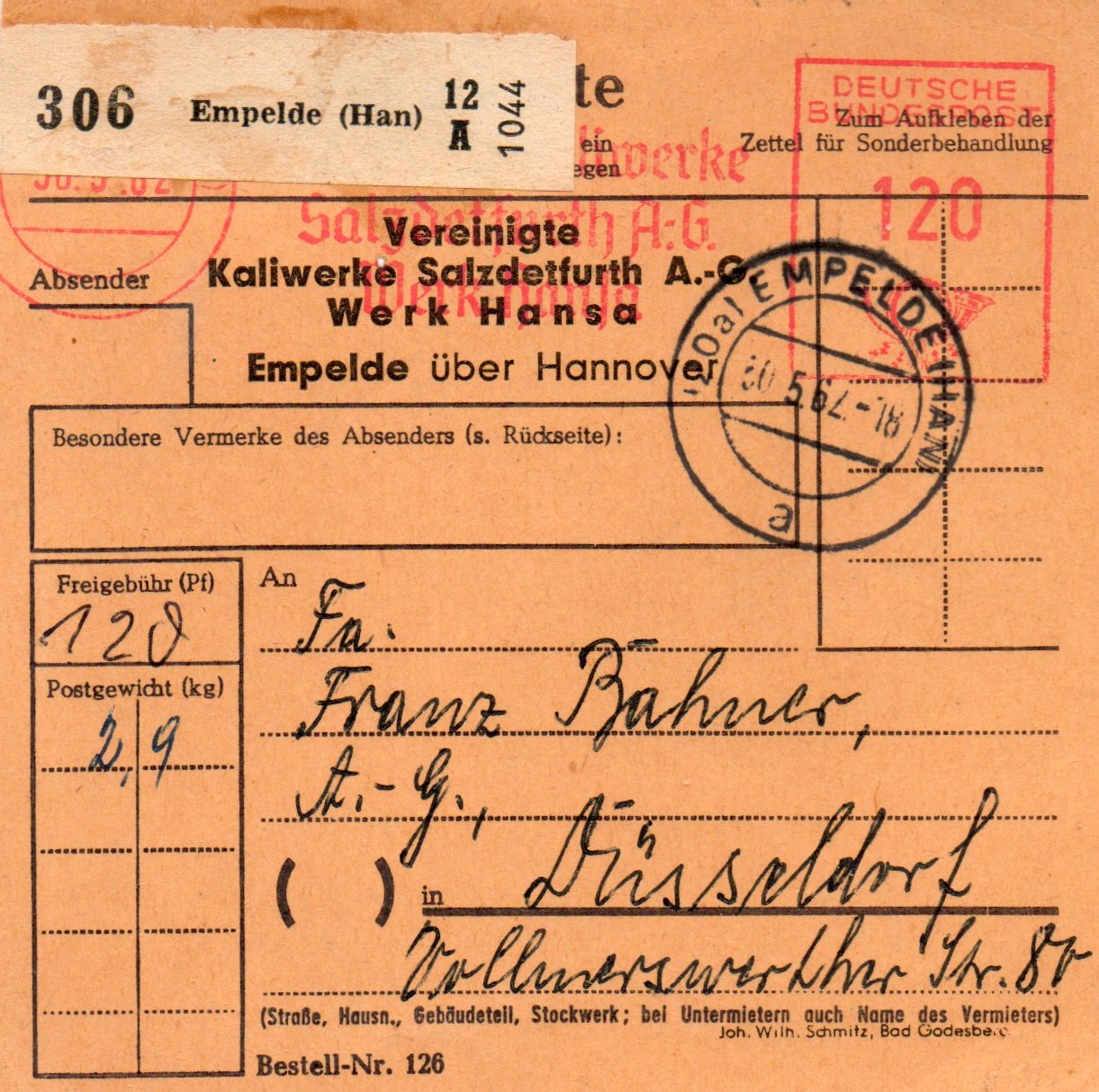 Rechtsseitig musste in der 3. Zone (bis 375 km) für das Paket von 2,9 kg im Mai 1962 ein Porto von 120 Pfg auf an Maschine eingestellt werden, die Sendung ging von EMPELDE (HAN) aus aus nach Düsseldorf.