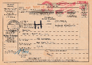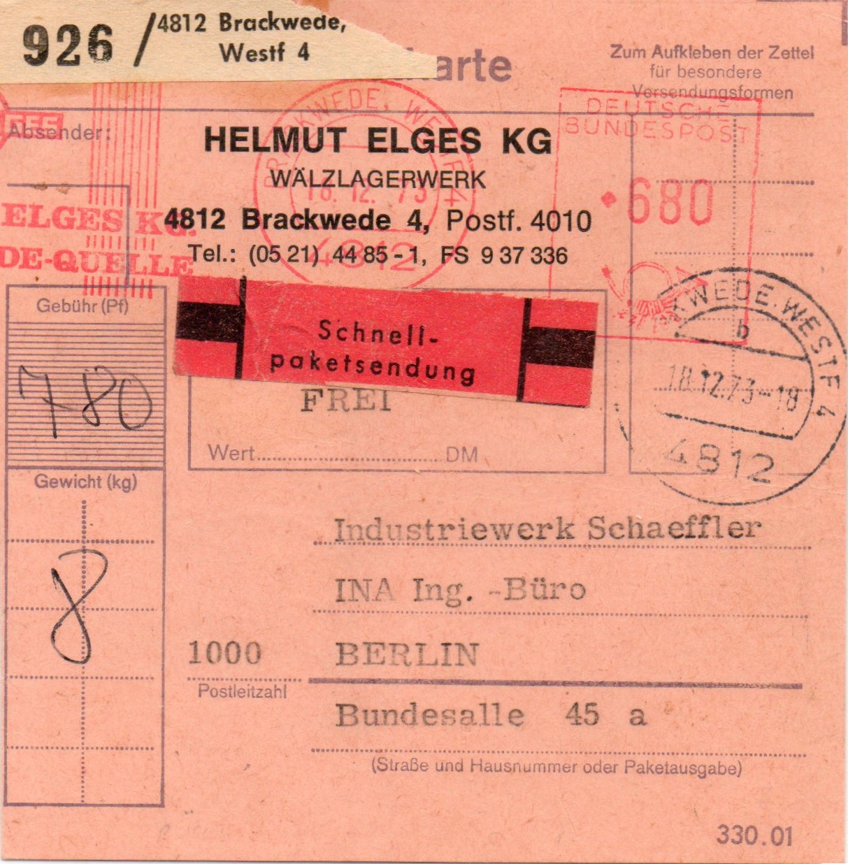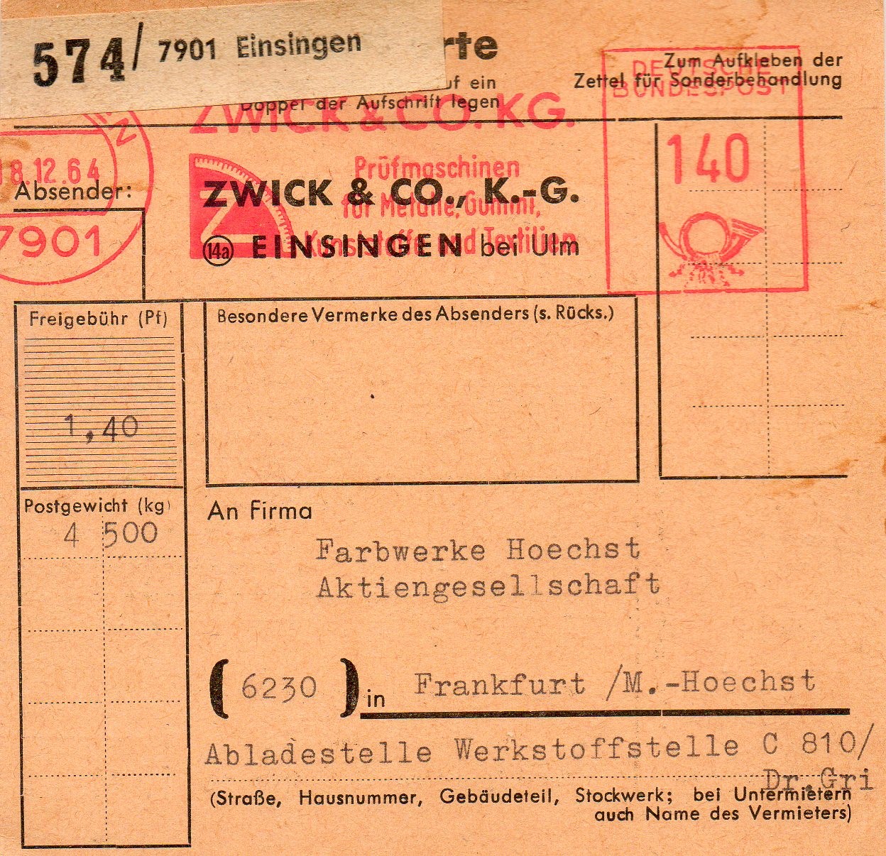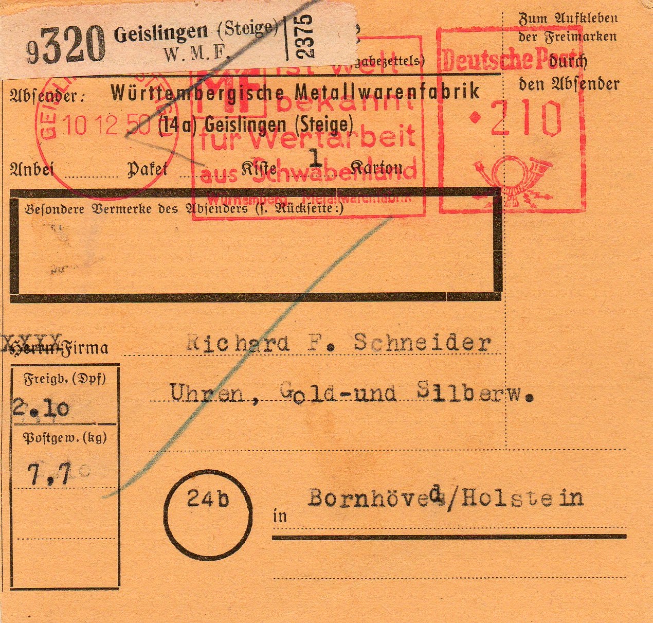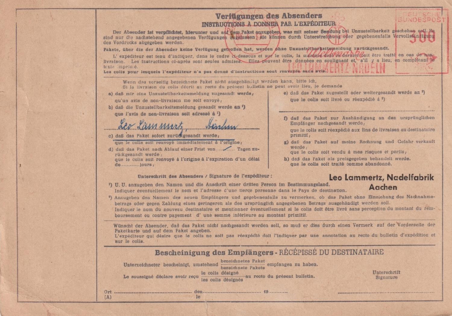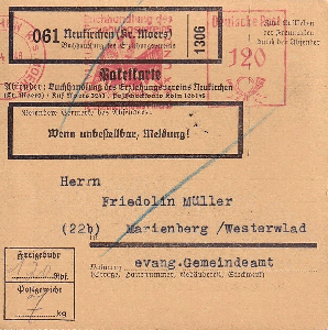 Rechtsseitig musste in der 3. Zone (bis 375 km) für das Paket von 2,9 kg im Mai 1962 ein Porto von 120 Pfg auf an Maschine eingestellt werden, die Sendung ging von EMPELDE (HAN) aus aus nach Düsseldorf.