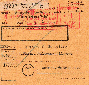 Diese Paketnummern-Zettel, z.B. der rechte von der W.M.F., werden gerade bei den Motiv-Philatelisten sehr gesucht.