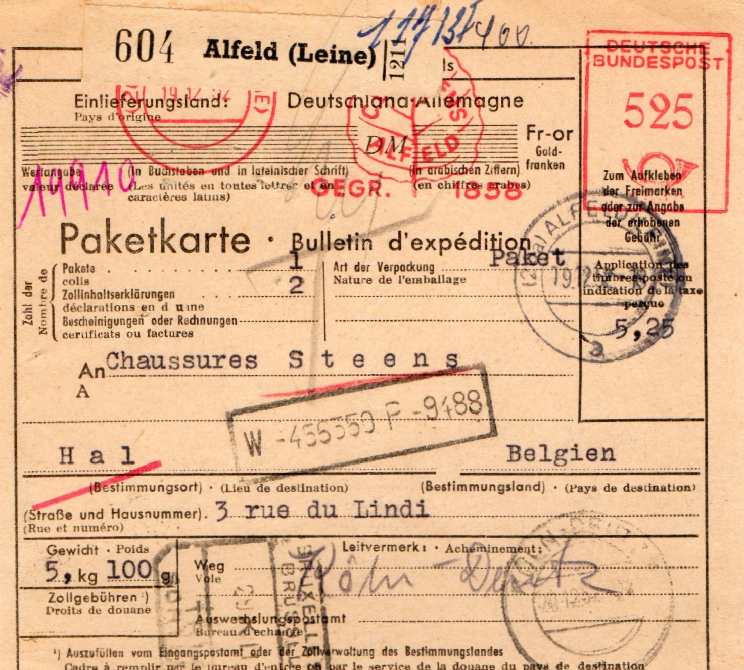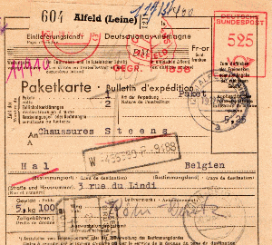 Auslandspaket im Gewicht von 5,1 kg, es ging im Dezember 1952 in Richtung Belgien, das Porto von 525 Pfg entrichtet auf einer in ALFELD (LEINE) stehende AFS-Maschine E-23, im Werbeklischee dargestellt ein stilisiertes Blatt.