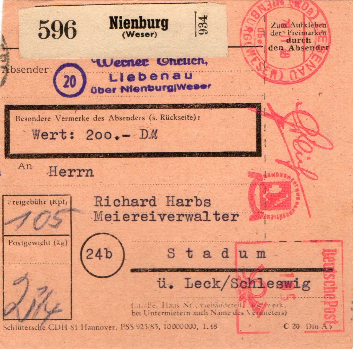 Die Gebühr für ein 3,5 kg Paket wurde von 1,10 DM auf 0,30 DM geändert, da rechts oben vermerkt wurde: 80 Pfg. auf dem Pkt. in Marken verklebt: Name /Zeuge Name.