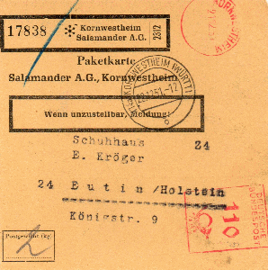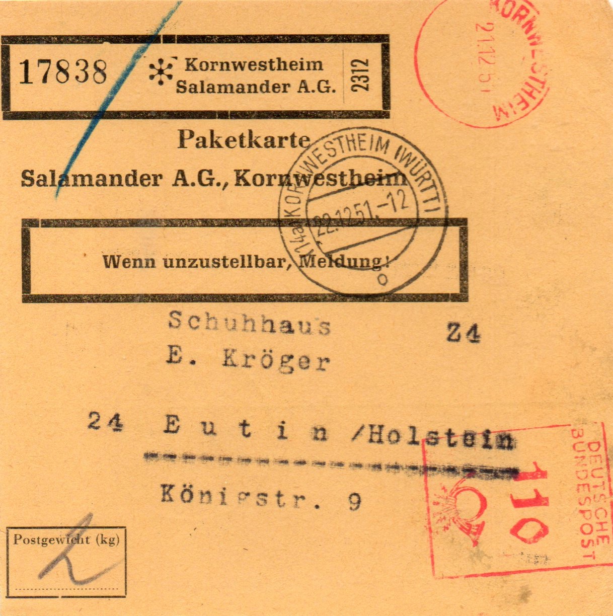 Selbstbucher-Paket, versandt in der 3. Zone (über 375 km) im Dezember 1951 vom Hersteller schöner und teurer Schuhe, der Firma Salamander aus KORNWESTHEIM in der schon höheren Portostufe zu 110 Pfg, interessant beim AFS das fehlende Werbeklischee, event. wurde es gerade repariert oder es sollte ein neues Motiv entworfen werden.