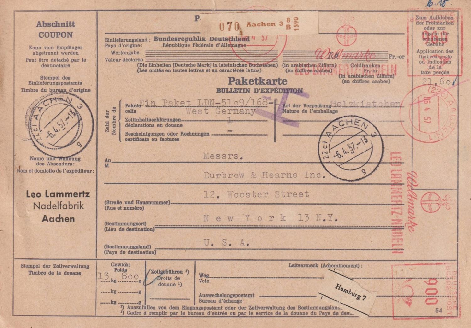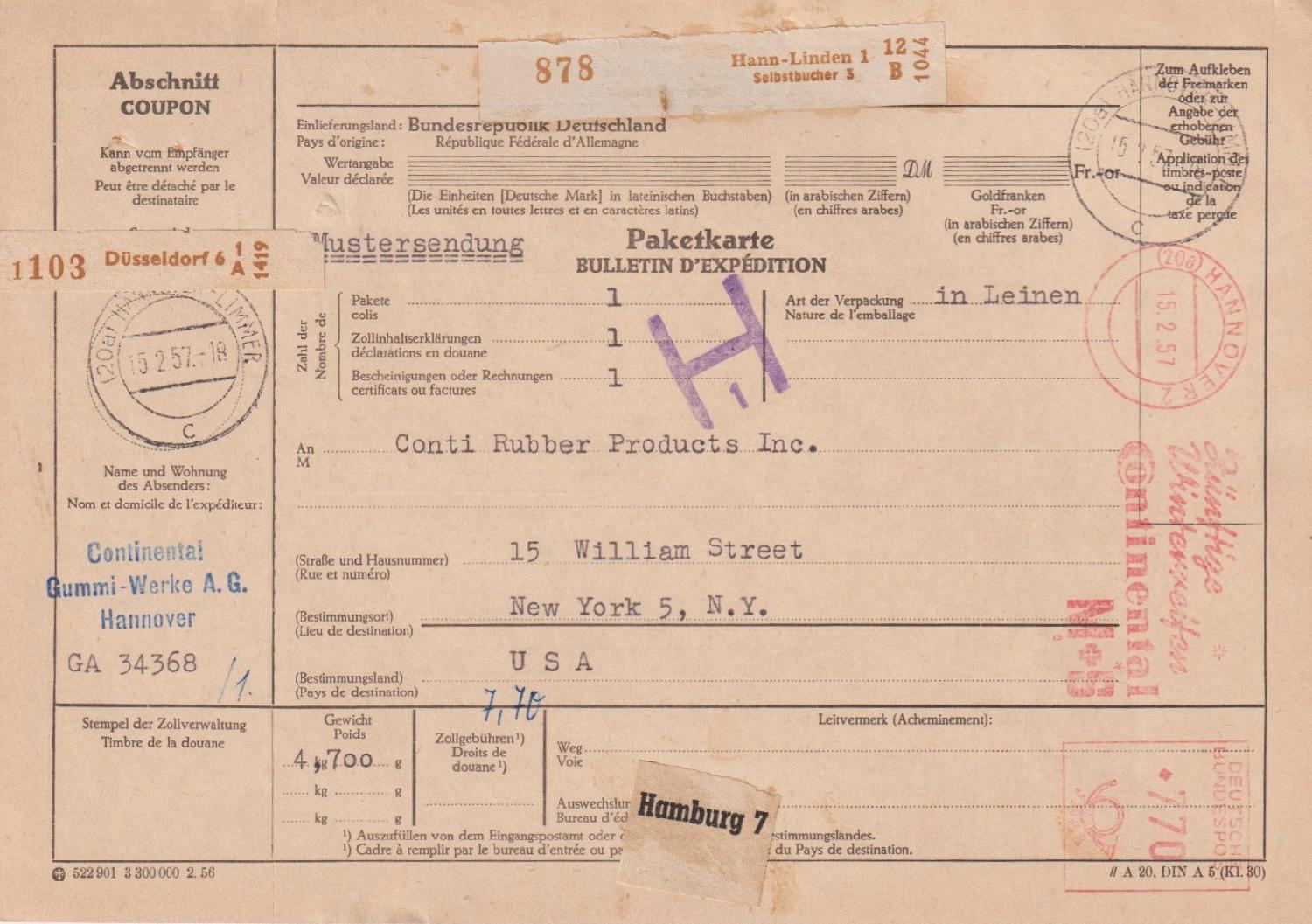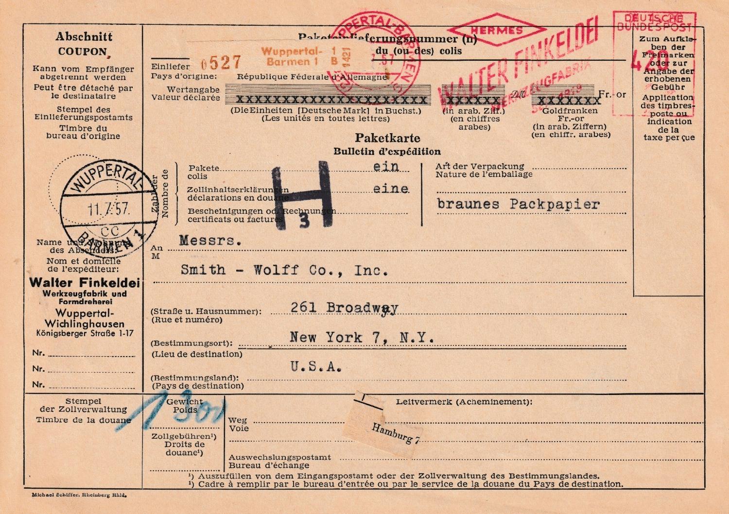Paketsendung über 1,5 kg, die Sendung ging von WUPPERTAL-BARMEN aus in Richtung USA, die Gebühr von 420 Pfg entrichtet im Juli 1957 mit einem AFS Typ E-23.