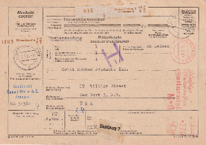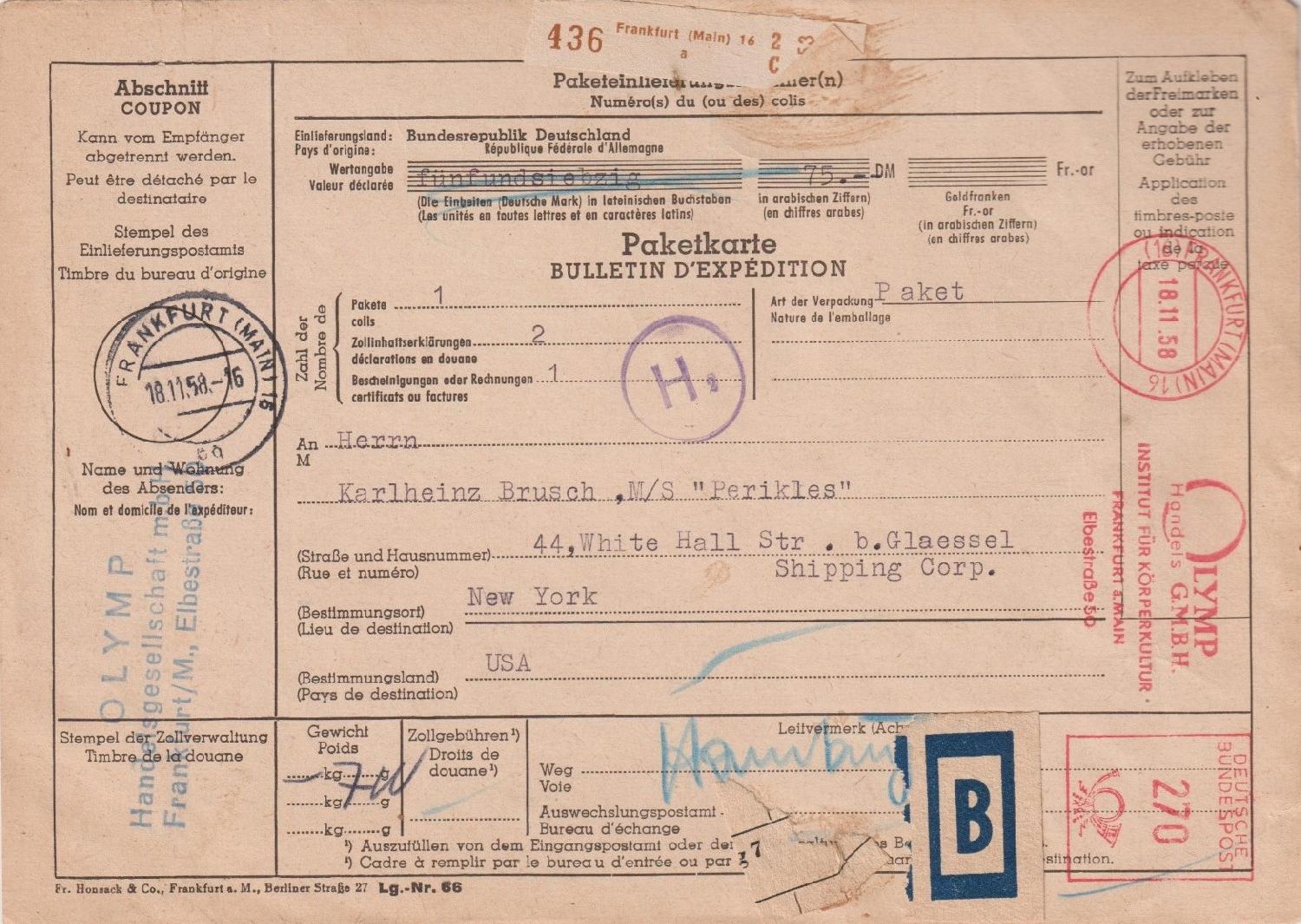 Auf dem Landweg bzw- über den Teich ging im November 1958 dieses Paket im Gewicht von 700 g vom PA FRANKFURT (MAIN) 16 aus nach New York, das Porto entrichtet mit einem Selbstbucher-AFS E-23.