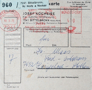Etwas preiswerter war das zweite Selbstbucher-Paket, es ging von BITTELBRONN aus in der 1. Zone (bis 150 km) im März 1975 in Richtung Haigerloch-Stetten in Baden-Württemberg, hier genutzt ein Postalia-AFS E-23 B.