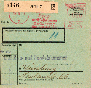Diesmal zur Abwechselung eine Postgut-Karte, die Sendung ging im September 1941 von BERLIN 7 aus in den Postverkehr; für die Sendung in der 4. Zone (bis 750 km) waren 60 Rpf zu entrichten, gedruckt auf einer AFS-Maschine E-5.