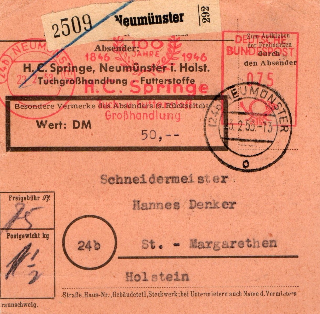 In NEUMÜNSTER wurde am 23.2.1953 dieses unversiegelte Wert-Paket an den Herrn Schneidermeister aufgegeben, die Gesamtgebühr errechnet sich aus dem Porto von 60 Pfg sowie der Gebühr von 15 Pfg für den Wert von 50 DM zusammen, der Absender war eine Tuchgroßhandlung.