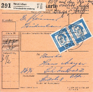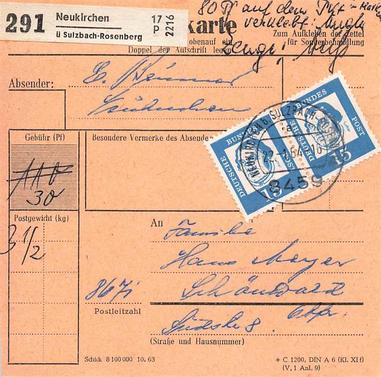 hier eine besondere Paketkarte aus der Bayern-Oberpfalz von Neukirchen b. Sulzbach-Rosenberg von 1964.