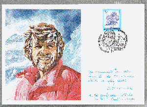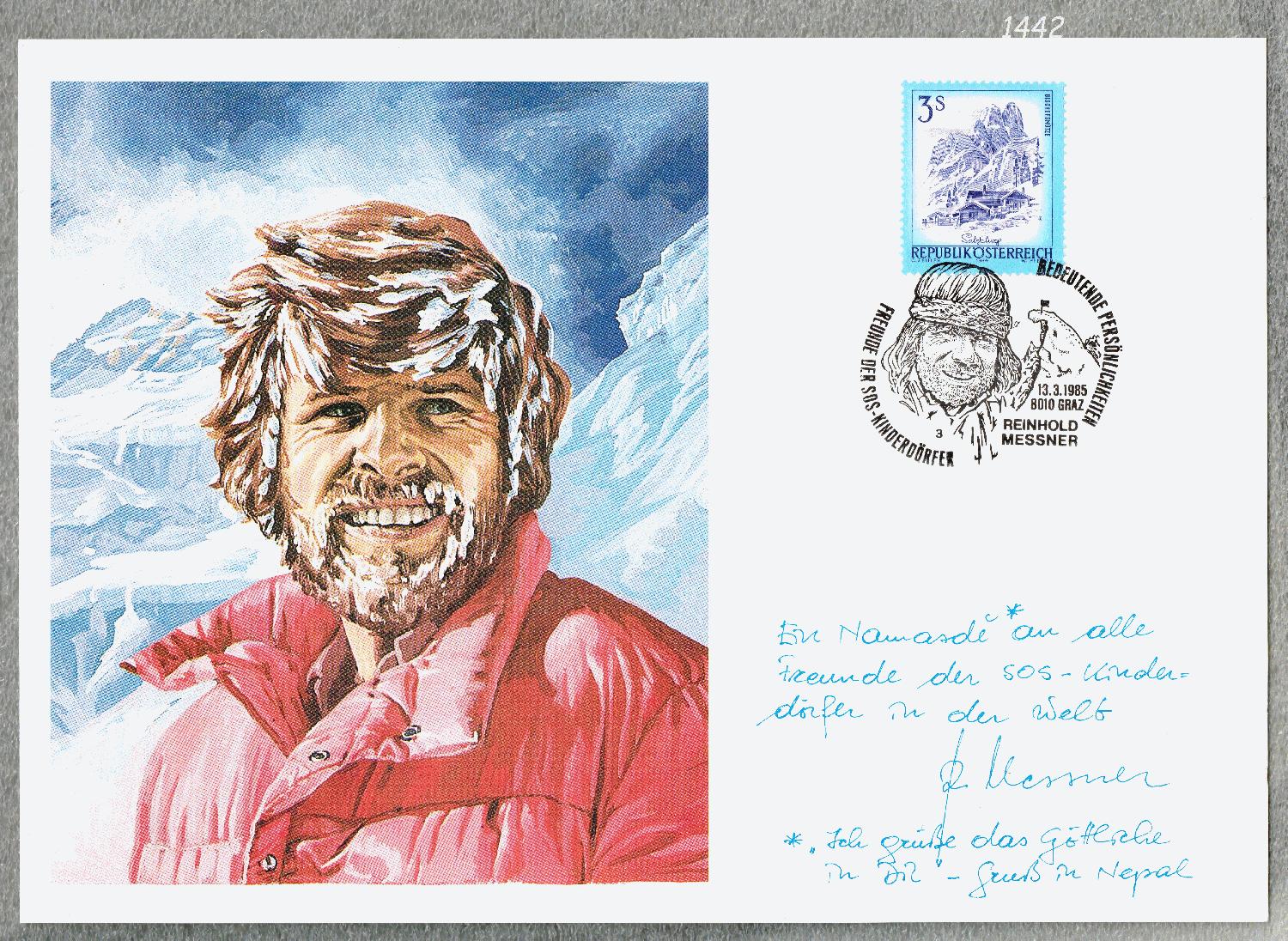 SOS Kinderdörfer Werbekarte mit Grafikporträt Reinhold Messner