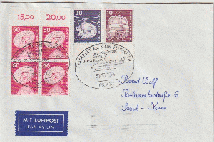 Zu dieser Zeit war ich weder dabei noch in der Planung, ich kann mich also nur auf Informationen stützen, die ich im Netz lese - ob das alles stimmt sei dahingestellt. Im bund-forum von 2012 lese ich z.B. daß es sich angeblich um einen Sonderflug des damaligen Bundespräsidenten Lübke anläßlich seiner Westafrika Reisen handelte und die Belege, die es offensichtlich in großen Mengen auf dem Markt gibt, nur als private Souvenirs anzusehen sind. Sieger hat diesen Stempel allerdings in seinen Katalog aufgenommen, was nicht verwundert, da er bei dem gezeigten Brief auch Adressat und Empfänger ist.