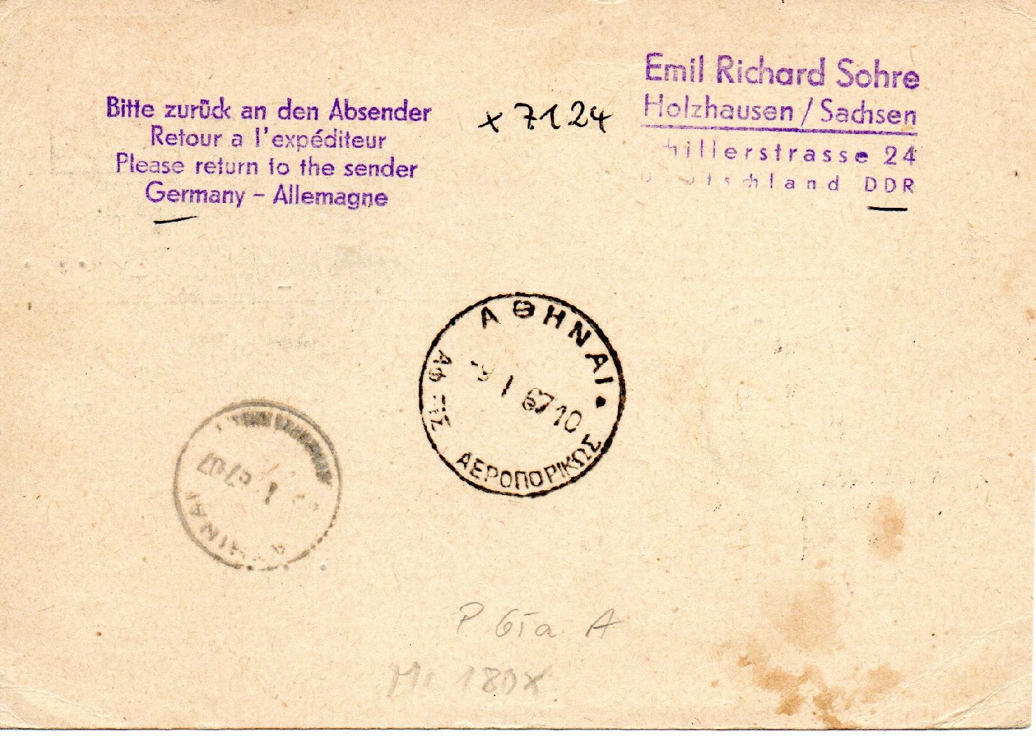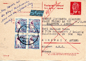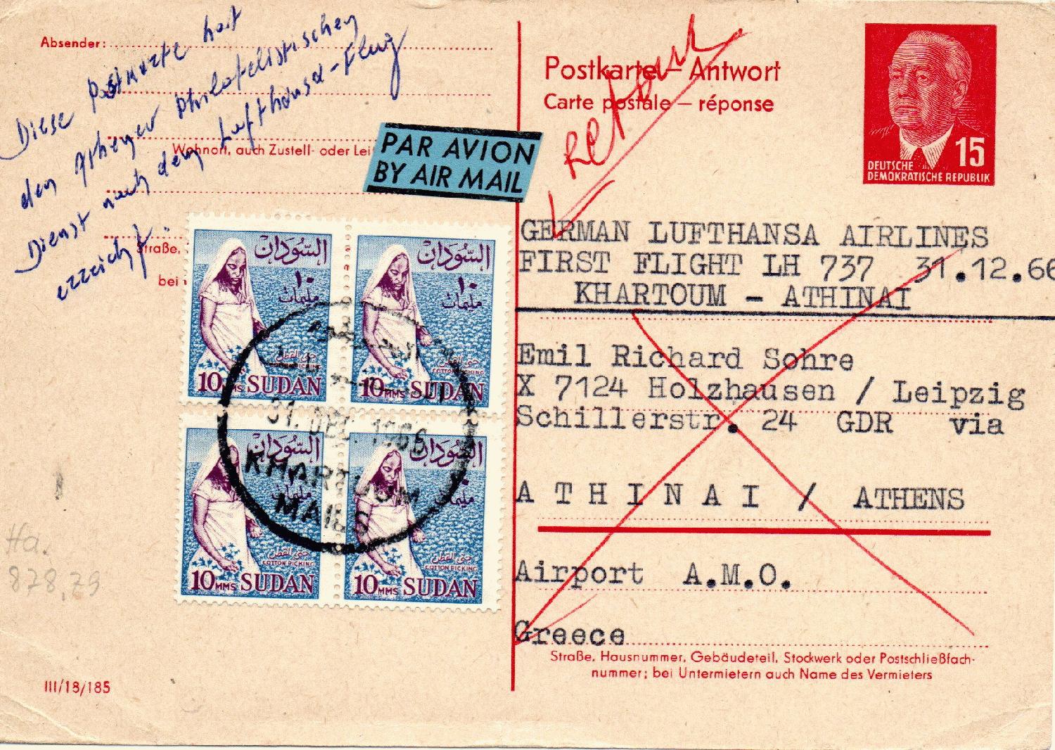 Benutz wurde eine DDR Ganzsachenpostkarte P 65a A, mit Zusatzfrankatur 4x Sudan Michel Nr. 180X mit Stempel vom 31.12.1966. Auf der Rückseite Stempel Athen vom 09.01.1967 und ein weiterer unleserlicher Stempel Von Athen.