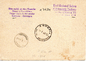 Der Adressat auf dem Beleg, ist der Postmaster des Flughafens in Kopenhagen. Offenbar sollte er den Brief mit der besagten Lufthansa-Maschine weitersenden. Noch seltsamer wirkt der Stempel auf der Rückseite "Please return to Sender". Der Absender wohnte jedoch offensichtlich in Oberndorf am Neckar, Stadtteil Lindenhof, wo sich die Hohenbergerstraße befindet.