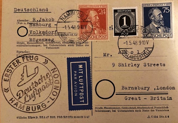 Es handelt sich wohl um einen "Erst-Flug Beleg" von 1948 von Hamburg nach London. Das Datum ist der 01.05.1948.