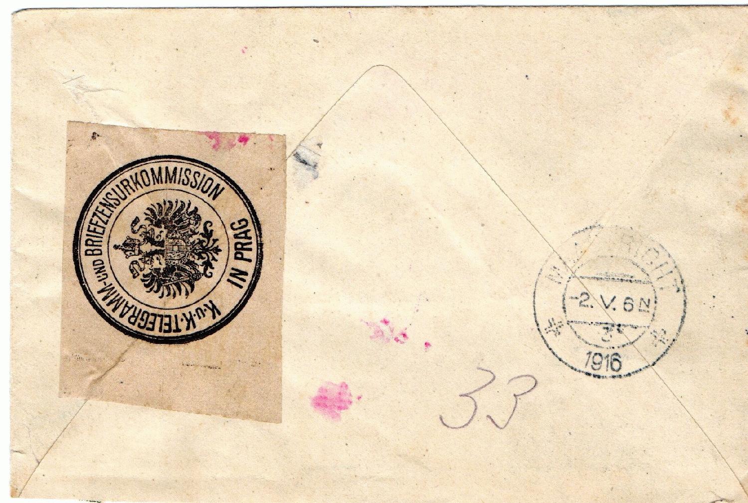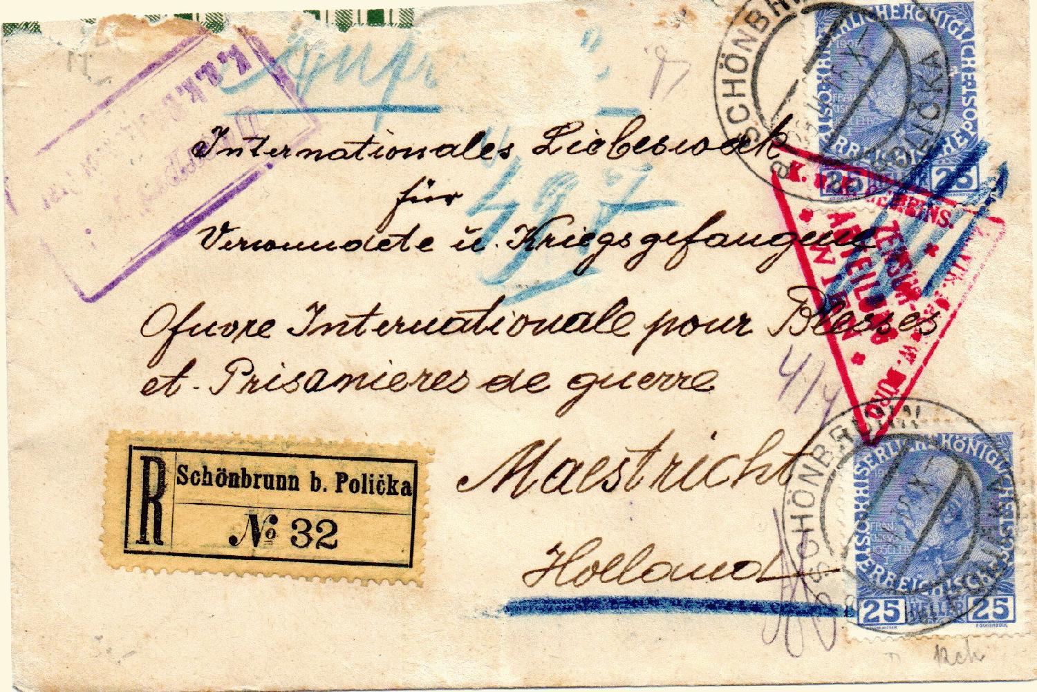 R-Brief vom 29.04.1916 von Schönbrunn bei Policka (heute Tschechien) nach Maastrich/Niederlande, dort Ankunft 02.06.1916, frankiert mit 2x Michel Nr. 147 gesamt 50 Heller, 25 Brief und 25 Einschreiben. Zensurstempel und Papiersiegel von Zensurstelle Prag und roter Dreieckstempel Zensur Wien.