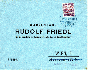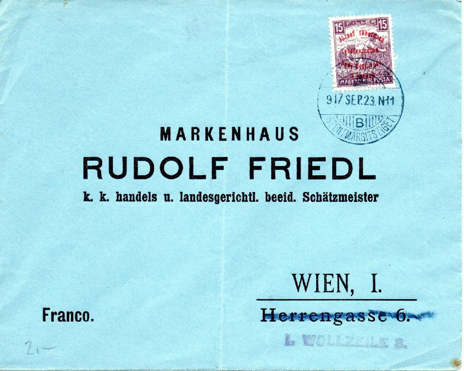 Brief vom 23.09.1917 von Budapest nach Wien, frankiert mit 15 Filler, Michel Nr. 209. Empfänger war das bekannte Markenhaus Rudolf Friedl.