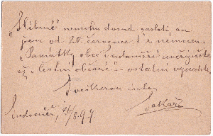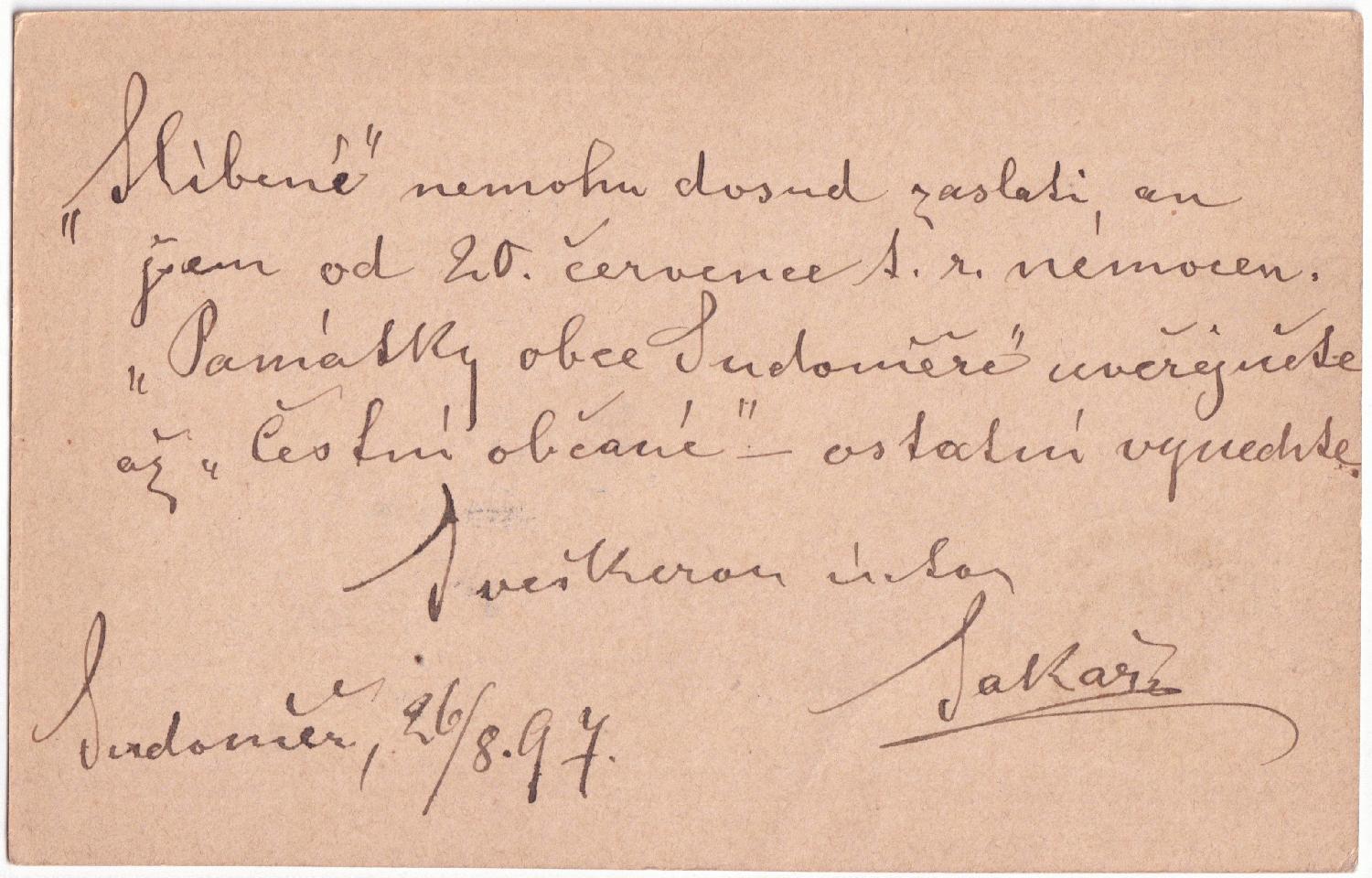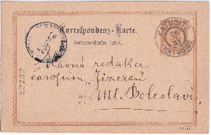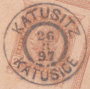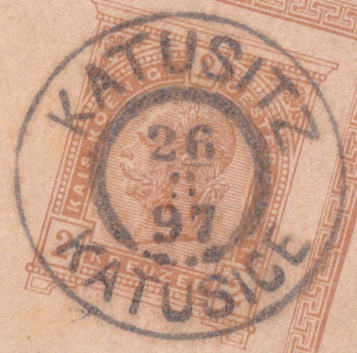 Die Karte wurde am 26.08.1897 in Katusitz, dem heutigen Katusice aufgegeben. Damals gehörte der Ort zu Österreich, heute liegt er in Tschechien.