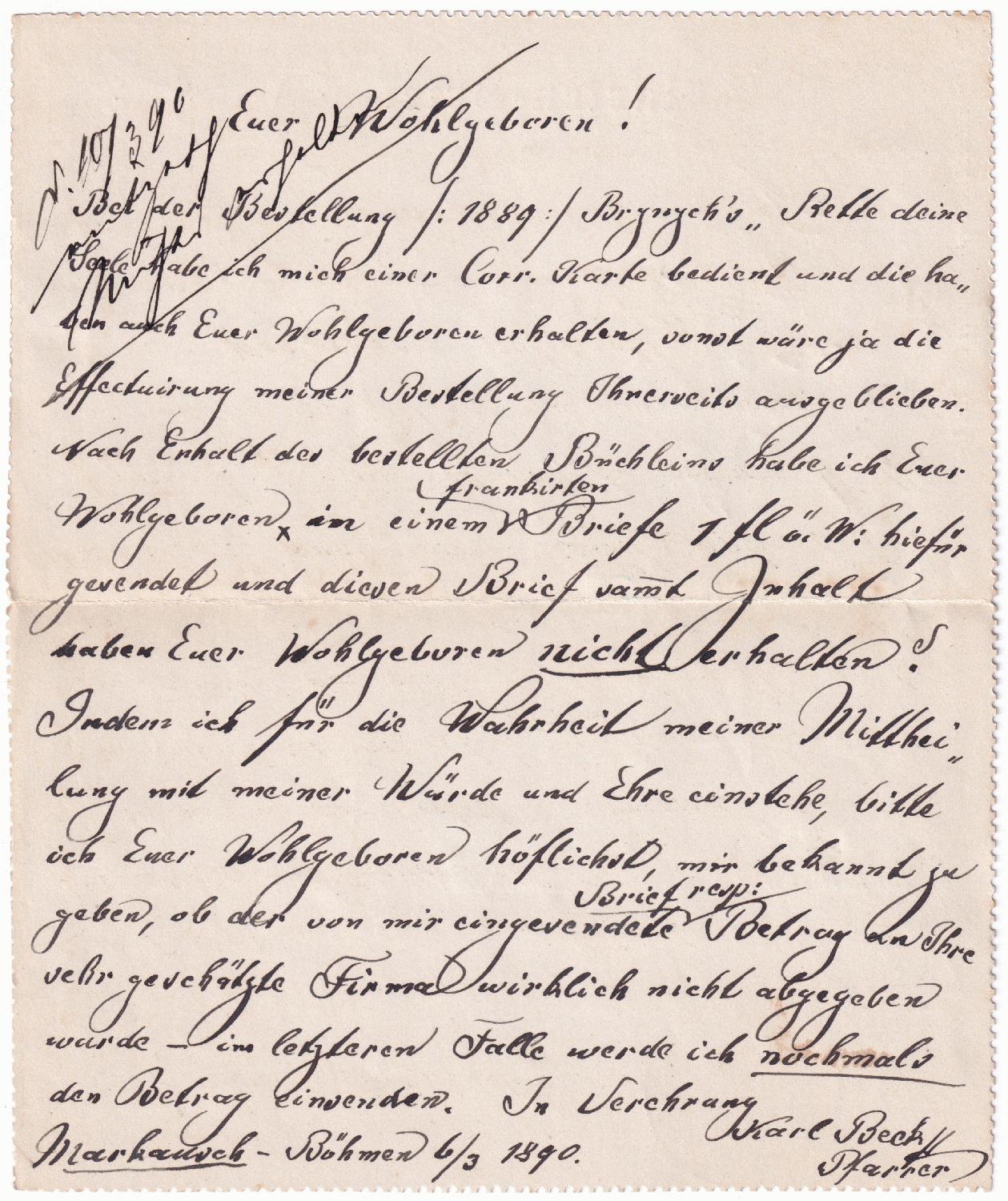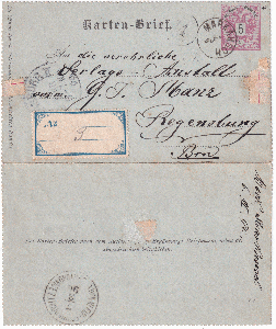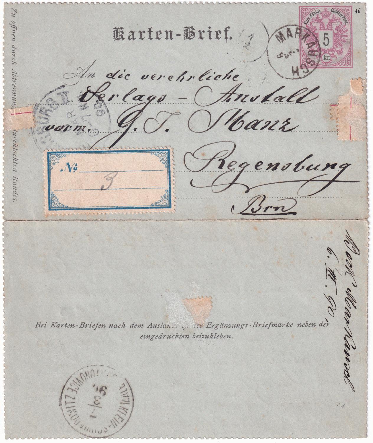 ein Kartenbrief aus Markausch über Klein-Schwadowitz nach Regensburg. Heute liegen beide ersten Orte in Tschechien und haben die Namen Markoušovice bzw. Malé Svatoňovice. Sie sind ca. 5 km voneinander entfernt. Leider hat jemand mehrere Zettel oder Briefmarken-Randstücke auf den Kartenbrief geklebt.