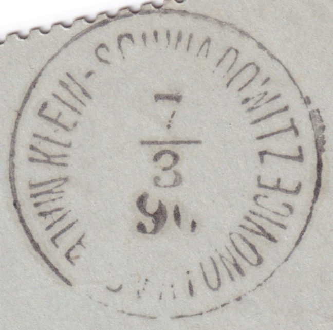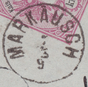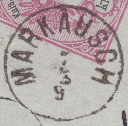 Der Stempel von Markausch vom 07.03.1890 hat einen Durchmesser von 19 mm. Je nach Definition zählt er noch zu den Fingerhutstempeln oder auch nicht. Der Stempel aus Klein Schwadowitz vom selben Tag ist zweisprachig Deutsch/Tschechisch.