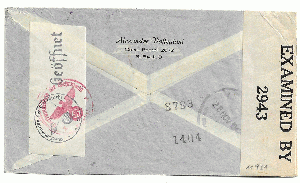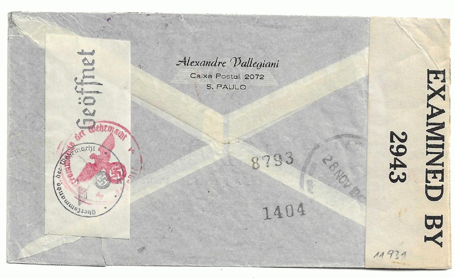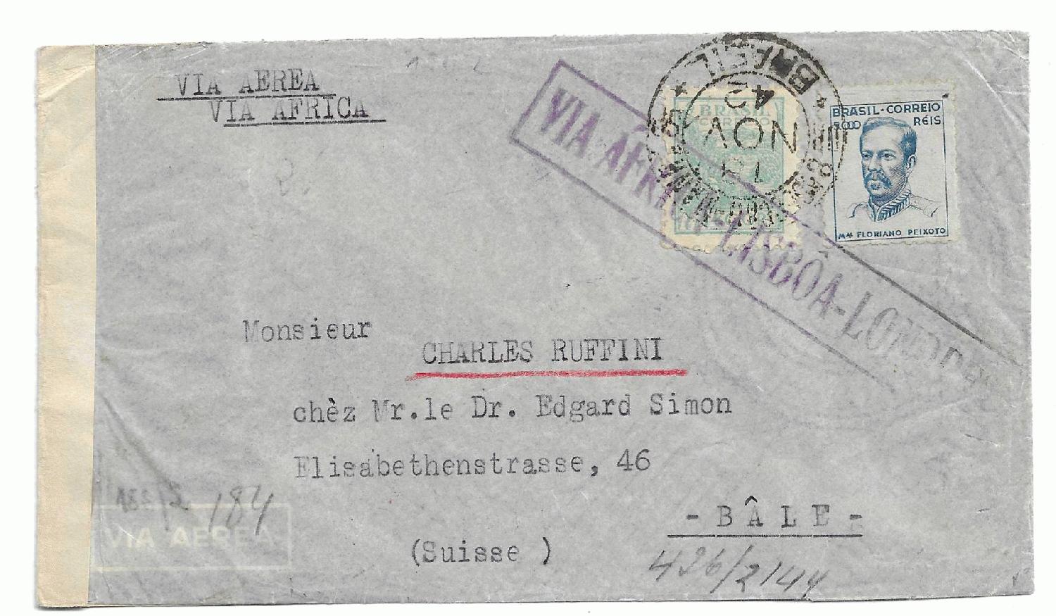 Der Luftpostverkehr über den Südatlantik war seit 1934 eine Domäne der Lufthansa und ihrer brasilianischen Tochtergesellschaft Condor. Nachdem Hitler im Herbst 1939 den Zweiten Weltkrieg losgetreten hatte, konnten deutsche Postflugzeuge ihren afrikanischen Stützpunkt nicht mehr anfliegen. Ihre Südamerikaroute übernahm die Fluggesellschaft LATI des faschistischen Italien, das sich noch nicht im Kriegszustand befand. Doch der Einfluss der LATI ging in Brasilien auf Druck der USA zurück. An ihr Stelle setzten die Amerikaner ihre Fluggesellschaft PanAm (Panamerikan Airways), auf deren Route 10 unser Brief nach Ausweis des Langstempels befördert – und zensiert - wurde. Allerdings nur bis Lissabon. Dort wurde er von der LATI übernommen und vermutlich bis Rom geflogen, von wo ihn eine deutsche Fluglinie in die Schweiz – und vorher zur Zensur – brachte.