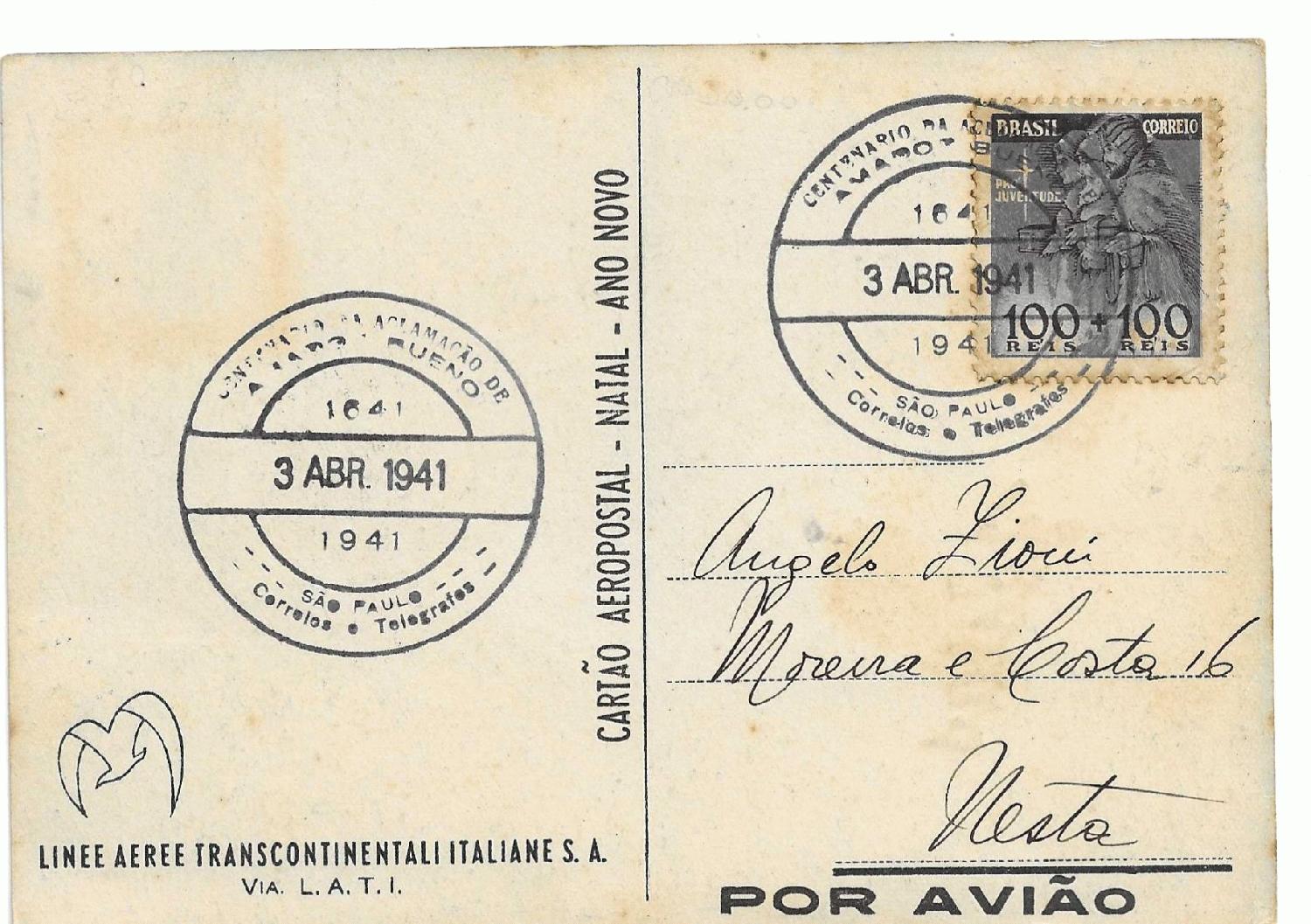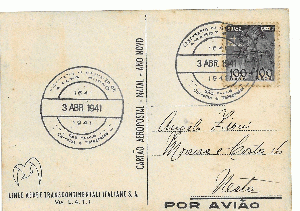 Reklamepostkarte der LATI aus dem Jahr 1941. Die italienische Gesellschaft setzte damit eine Tradition der CONDOR fort. Auf der Adressseite trägt die LATI-Karte einen Sonderstempel, dessen Anlass mir wegen fehlender Sprachkenntnis verborgen bleibt. Aber vielleicht kann ein Leser helfen.