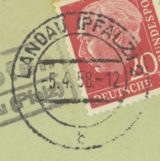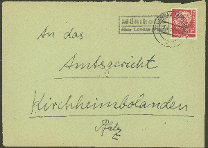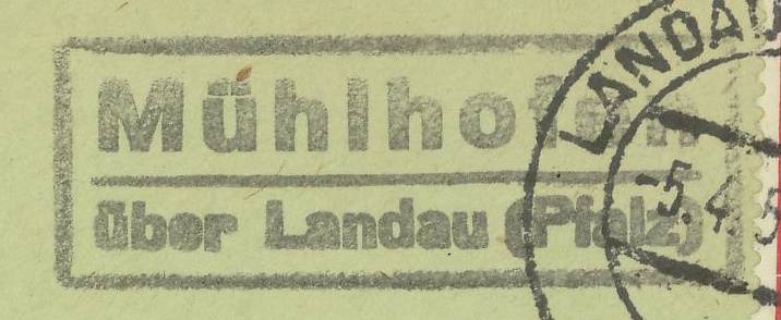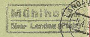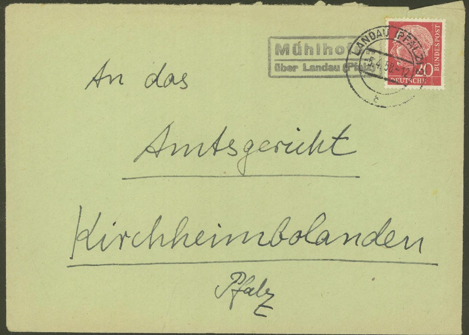 Aus Mühlhofen ein Brief, der am 5.4.1958 über Landau nach Kirchheimbolanden gelaufen ist; kleiner hätte der Briefumschlag nicht sein dürfen.